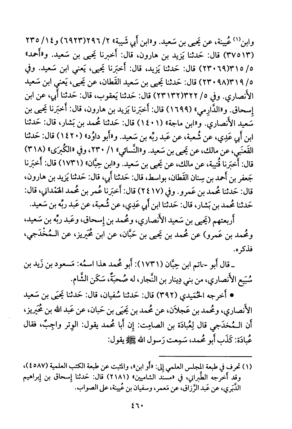 • أخرجه ابن حبان (١٧٣٢) قال: أخبرنا عبد الله بن قَحطَبة بن مرزوق، بِفَم الصِّلْح، قال: حدثنا أحمد بن مَنيع، قال: حدثنا هُشيم، قال: أخبرنا يحيى بن سعيد، قال: أخبرنا محمد بن يحيى بن حبان الأَنصاري، عن ابن محيريز، قال: جاء رجل إلى عبادة بن الصامت، فقال: يا أبا الوليد، إني سمعت أبا محمد الأَنصاري يقول: الوتر واجب، فقال عبادة: كذب أَبو محمد، سمعت رسول الله صَلى الله عَليه وسَلم يقول: