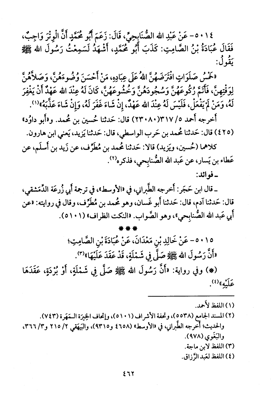 ٥٠١٤ - عن عبد الله الصُّنَابحي، قال: زعم أَبو محمد أن الوتر واجب، فقال عبادة بن الصامت: كذب أَبو محمد، أشهد لسمعت رسول الله صَلى الله عَليه وسَلم يقول: