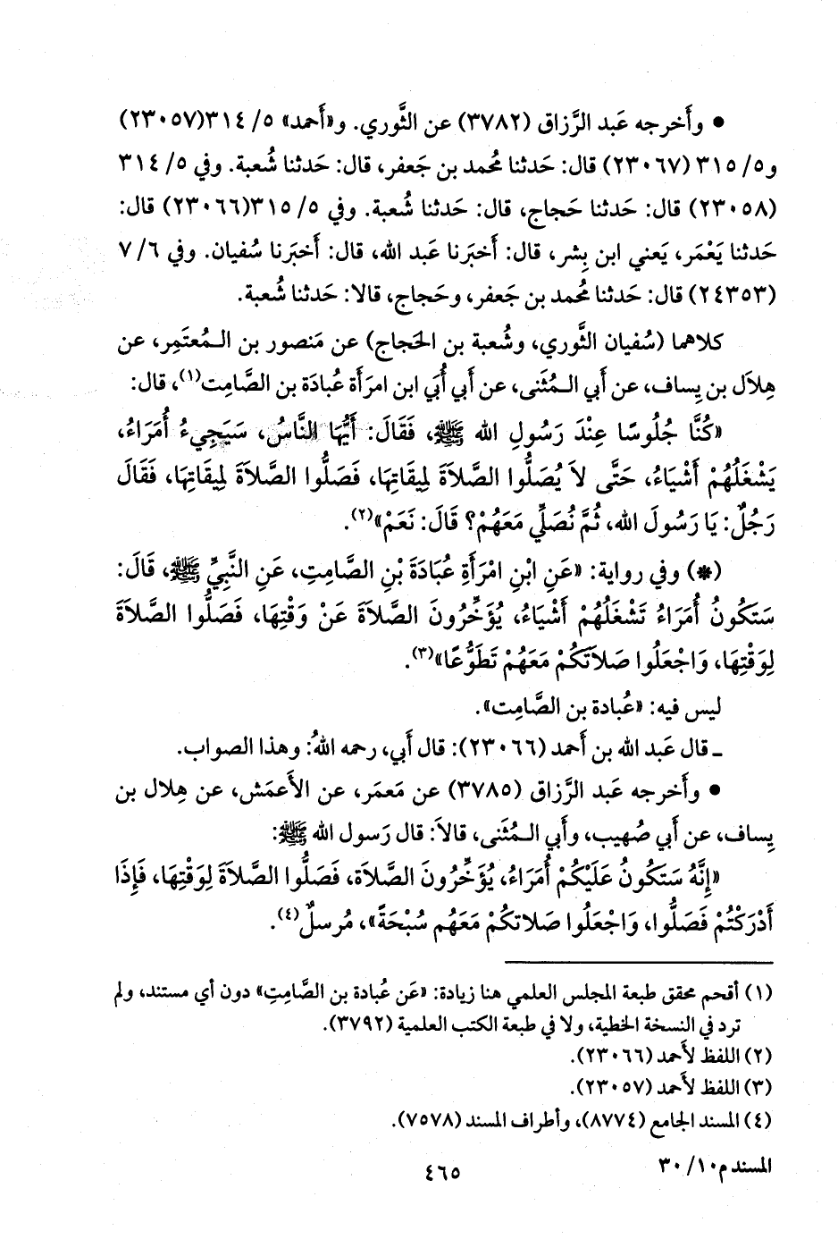 - وفي رواية: «عن ابن امرأة عبادة بن الصامت، عن النبي صَلى الله عَليه وسَلم قال: ستكون أمراء تشغلهم أشياء، يؤخرون الصلاة عن وقتها، فصلوا الصلاة لوقتها، واجعلوا صلاتكم معهم تطوعا» (¬٣).