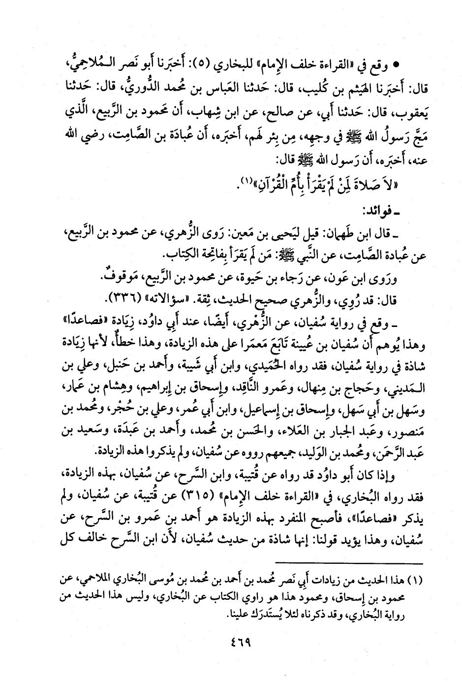 - قال ابن طهمان: قيل ليحيى بن مَعين: روى الزُّهْري، عن محمود بن الربيع، عن عبادة الصامت، عن النبي صَلى الله عَليه وسَلم: من لم يقرأ بفاتحة الكتاب.