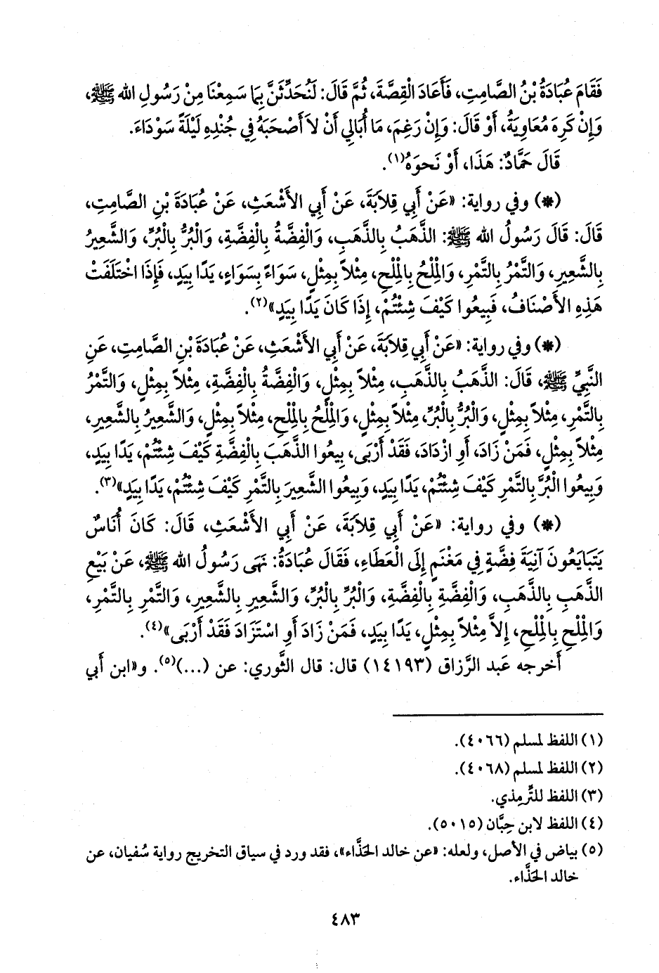 - وفي رواية: «عن أبي قلابة، عن أبي الأشعث، عن عبادة بن الصامت، عن النبي صَلى الله عَليه وسَلم قال: الذهب بالذهب، مثلا بمثل، والفضة بالفضة، مثلا بمثل، والتمر بالتمر، مثلا بمثل، والبر بالبر، مثلا بمثل، والملح بالملح، مثلا بمثل، والشعير بالشعير، مثلا بمثل، فمن زاد، أو ازداد، فقد أربى، بيعوا الذهب بالفضة كيف شئتم، يدا بيد، وبيعوا البر بالتمر كيف شئتم، يدا بيد، وبيعوا الشعير بالتمر كيف شئتم، يدا بيد» (¬١).