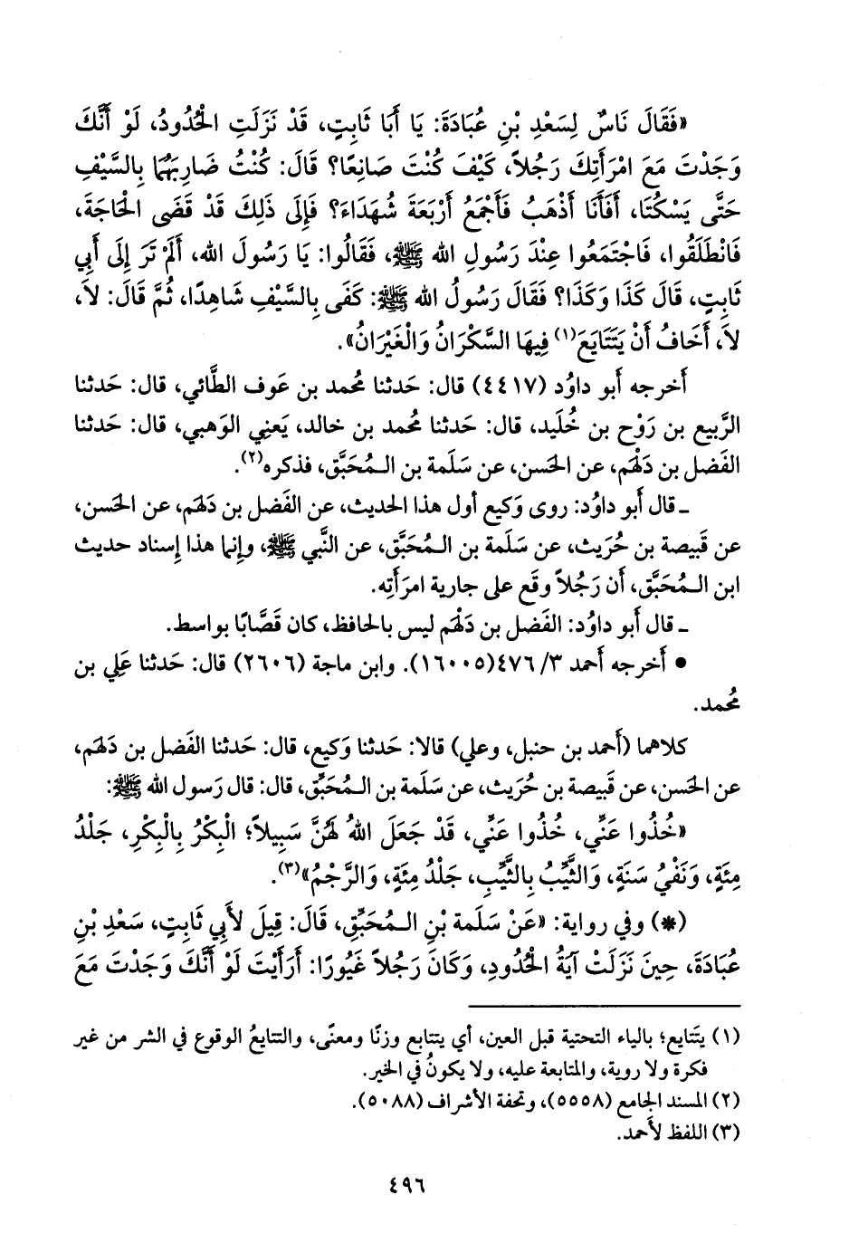 - وفي رواية: «عن سلمة بن المُحَبَّق، قال: قيل لأبي ثابت، سعد بن عبادة، حين نزلت آية الحدود، وكان رجلا غيورا: أرأيت لو أنك وجدت مع