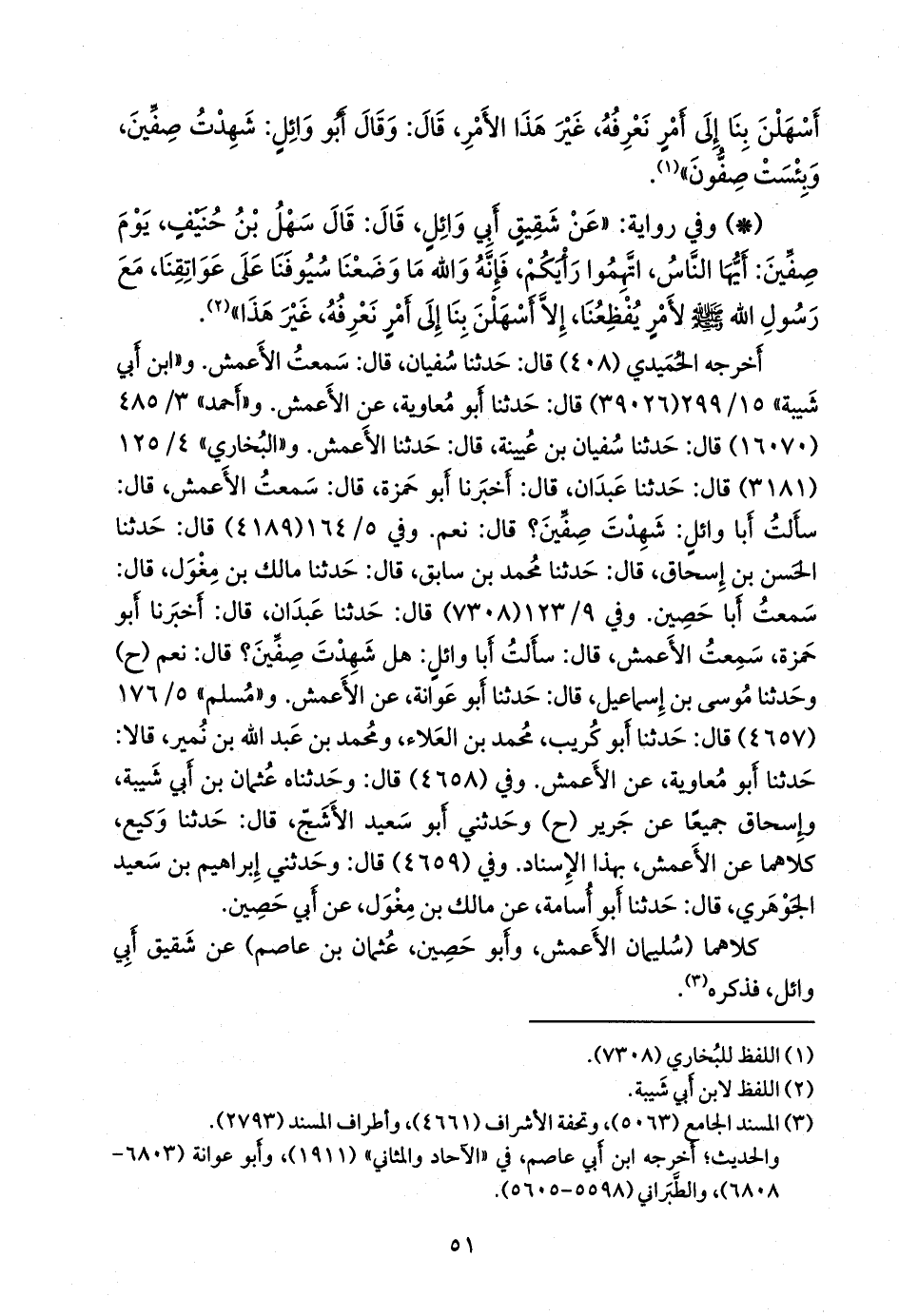 أخرجه الحُميدي (٤٠٨) قال: حدثنا سفيان، قال: سمعت الأعمش. و «ابن أبي شيبة» (٣٩٠٢٦) قال: حدثنا أَبو معاوية، عن الأعمش. و «أحمد» ٣/ ٤٨٥ (١٦٠٧٠) قال: حدثنا سفيان بن عُيينة، قال: حدثنا الأعمش. و «البخاري» ٤/ ١٠٣ (٣١٨١) قال: حدثنا عبدان، قال: أخبرنا أَبو حمزة، قال: سمعت الأعمش، قال: سألتُ أَبا وائل: شهدت صفين؟ قال: نعم. وفي ٥/ ١٢٨ (٤١٨٩) قال: حدثنا الحسن بن إسحاق، قال: حدثنا محمد بن سابق، قال: حدثنا مالك بن مِغْوَل، قال: سمعت أبا حصين. وفي ٩/ ١٠٠ (٧٣٠٨) قال: حدثنا عبدان، قال: أخبرنا أَبو حمزة، قال: سمعت الأعمش، قال: سألتُ أَبا وائل: هل شهدت صفين؟ قال: نعم (ح) وحدثنا موسى بن إسماعيل، قال: حدثنا أَبو عَوانة، عن الأعمش. و «مسلم» ٥/ ١٧٦ (٤٦٥٧) قال: حدثنا أَبو كُريب محمد بن العلاء، ومحمد بن عبد الله بن نُمير، قالا: حدثنا أَبو معاوية، عن الأعمش. وفي (٤٦٥٨) قال: وحدثناه عثمان بن أبي شيبة، وإسحاق جميعا عن جَرير (ح) وحدثني أَبو سعيد الأشج، قال: حدثنا وكيع، كلاهما عن الأعمش، بهذا الإسناد. وفي (٤٦٥٩) قال: وحدثني إبراهيم بن سعيد الجوهري، قال: حدثنا أَبو أُسامة، عن مالك بن مِغْوَل، عن أبي حصين.