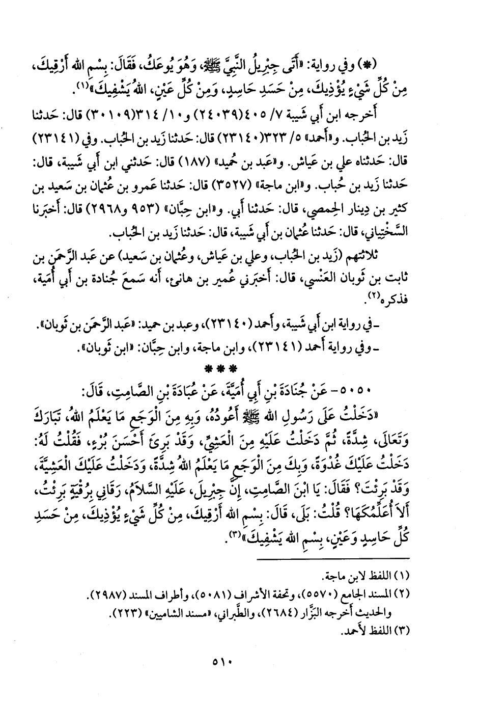 «دخلت على رسول الله صَلى الله عَليه وسَلم أعوده، وبه من الوجع ما يعلم الله، تبارك وتعالى، شدة، ثم دخلت عليه من العشي، وقد برئ أحسن برء، فقلت له: دخلت عليك غدوة، وبك من الوجع ما يعلم الله شدة، ودخلت عليك العشية، وقد برئت؟ فقال: يا ابن الصامت، إن جبريل، عليه السلام، رقاني برقية برئت، ألا أعلمكها؟ قلت: بلى، قال: بسم الله أرقيك، من كل شيء يؤذيك، من حسد كل حاسد وعين، بسم الله يشفيك» (¬١).