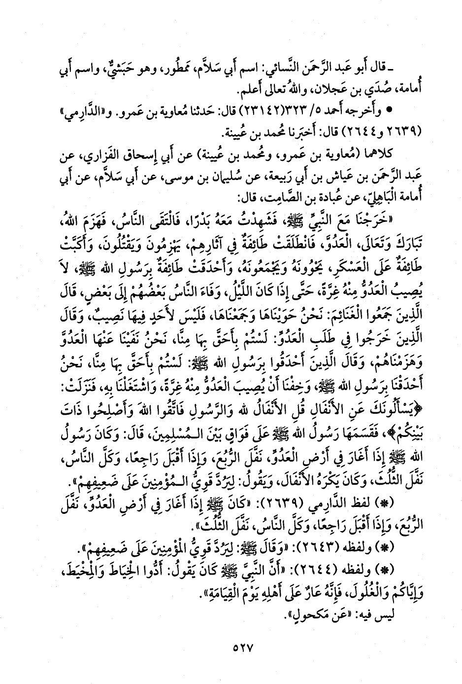 «خرجنا مع النبي صَلى الله عَليه وسَلم فشهدت معه بدرا، فالتقى الناس، فهزم الله، تبارك وتعالى، العدو، فانطلقت طائفة في آثارهم، يهزمون ويقتلون، وأكبت طائفة على العسكر، يحوونه ويجمعونه، وأحدقت طائفة برسول الله صَلى الله عَليه وسَلم لا يصيب العدو منه غرة، حتى إذا كان الليل، وفاء الناس بعضهم إلى بعض، قال الذين جمعوا الغنائم: نحن حويناها وجمعناها، فليس لأحد فيها نصيب، وقال الذين خرجوا في طلب العدو: لستم بأحق بها منا، نحن نفينا عنها العدو وهزمناهم، وقال الذين أحدقوا برسول الله صَلى الله عَليه وسَلم: لستم بأحق بها منا، نحن أحدقنا برسول الله صَلى الله عَليه وسَلم وخفنا أن يصيب العدو منه غرة، واشتغلنا به، فنزلت: {يسألونك عن الأنفال قل الأنفال لله والرسول فاتقوا الله وأصلحوا ذات بينكم}، فقسمها رسول الله صَلى الله عَليه وسَلم على فواق بين المسلمين، قال: وكان رسول الله صَلى الله عَليه وسَلم إذا أغار في أرض العدو، نفل الربع، وإذا أقبل راجعا، وكل الناس، نفل الثلث، وكان يكره الأنفال، ويقول: ليرد قوي المؤمنين على ضعيفهم».