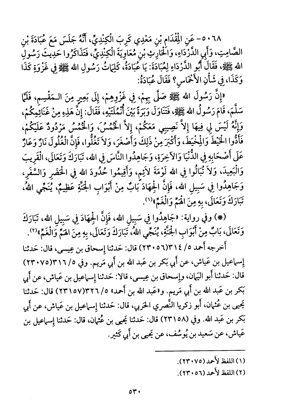 ٥٠٦٨ - عن المقدام بن مَعْدي كرب الكندي، أنه جلس مع عبادة بن الصامت، وأبي الدرداء، والحارث بن معاوية الكندي، فتذاكروا حديث رسول الله صَلى الله عَليه وسَلم فقال أَبو الدرداء لعبادة: يا عبادة، كلمات رسول الله صَلى الله عَليه وسَلم في غزوة كذا وكذا، في شأن الأخماس؟ فقال عبادة: