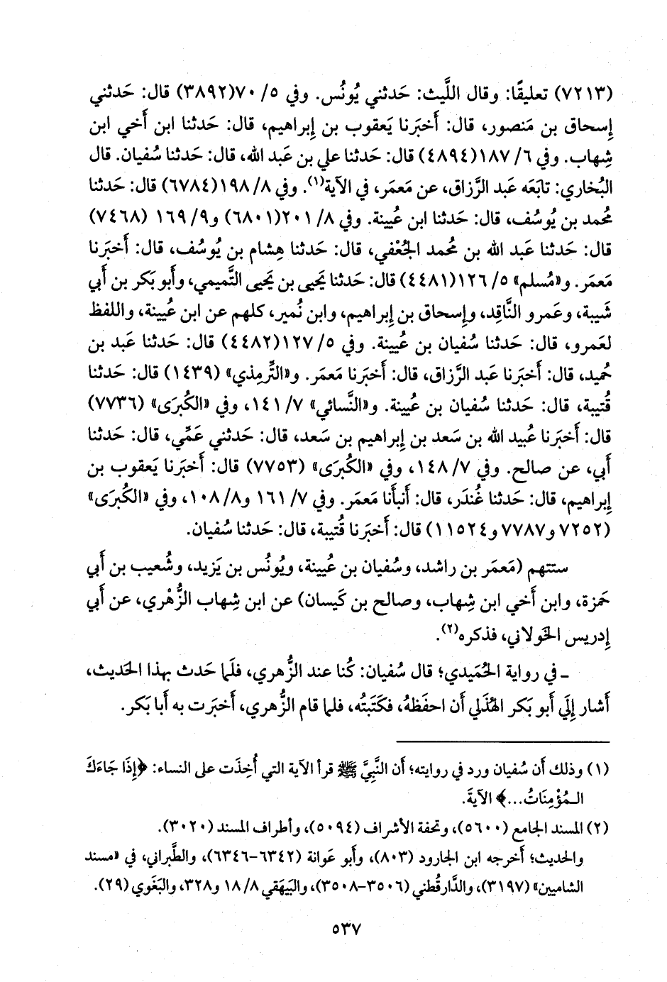 - في رواية الحميدي؛ قال سفيان: كنا عند الزُّهْري، فلما حدث بهذا الحديث، أشار إليَّ أَبو بكر الهذلي أنِ احفظه، فكتبته، فلما قام الزُّهْري، أخبرت به أبا بكر.