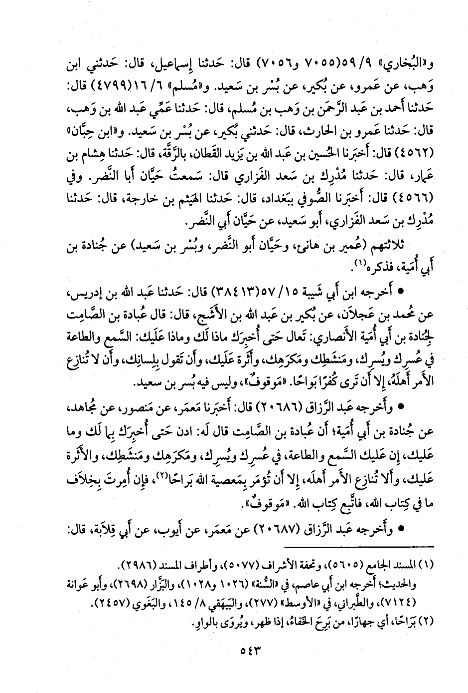 قال عبادة بن الصامت، لجنادة أبي أُمية: يا جنادة، ألا أخبرك بالذي لك، والذي عليك؟ إن عليك السمع والطاعة، في عسرك ويسرك، ومنشطك ومكرهك، وفي الأثرة عليك، وان تدع لسانك بالقول، وألا تنازع الأمر أهله، إلا أن تؤمر بمعصية الله براحا، فان أمرت بخلاف ما في كتاب الله، فاتبع كتاب الله. «موقوف»، لكنه من طريق أبي قلابة.