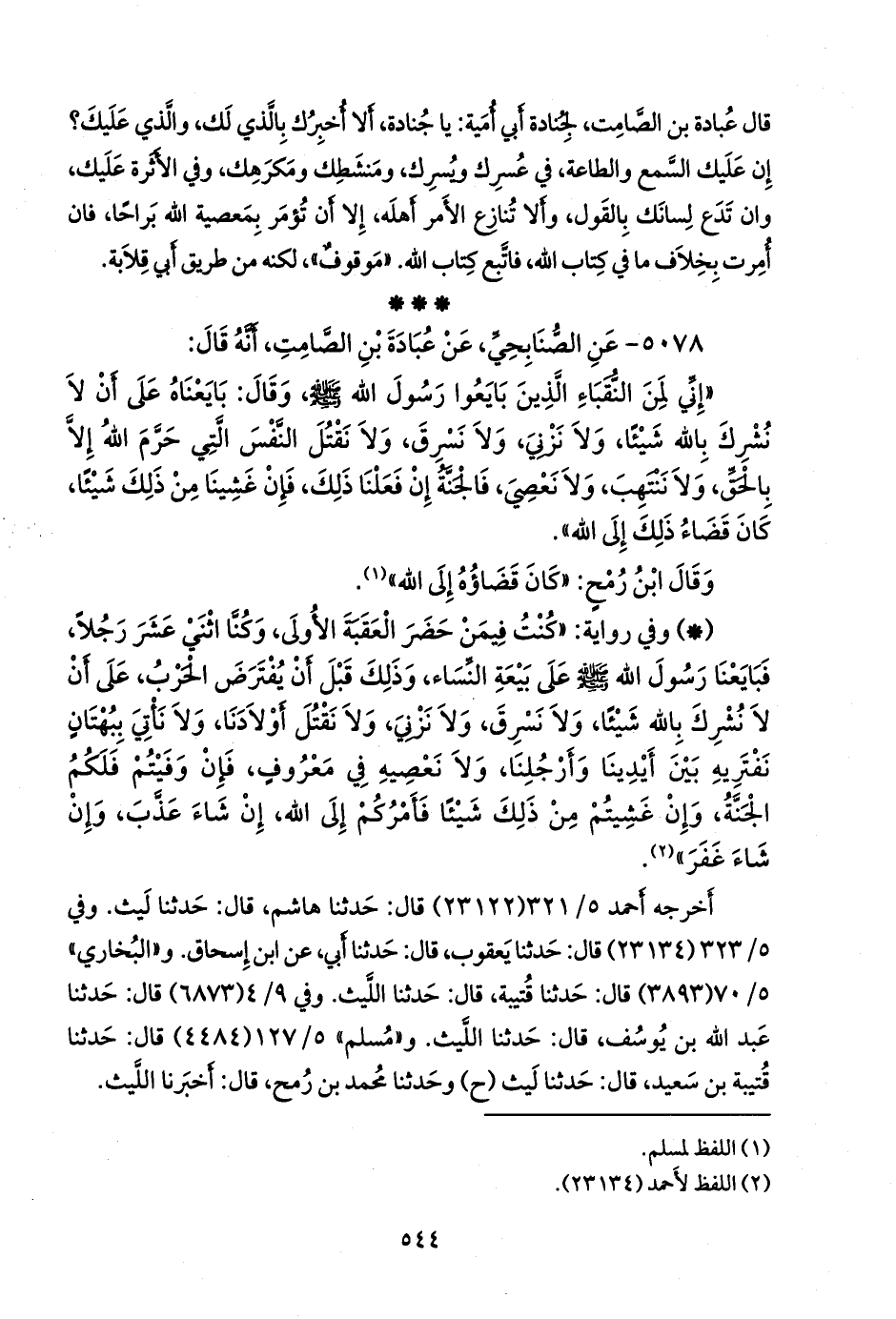 - وفي رواية: «كنت فيمن حضر العقبة الأولى، وكنا اثني عشر رجلا، فبايعنا رسول الله صَلى الله عَليه وسَلم على بيعة النساء، وذلك قبل أن يفترض الحرب، على أن لا نشرك بالله شيئا، ولا نسرق، ولا نزني، ولا نقتل أولادنا، ولا نأتي ببهتان نفتريه بين أيدينا وأرجلنا، ولا نعصيه في معروف، فإن وفيتم فلكم الجنة، وإن غشيتم من ذلك شيئًا فأمركم إلى الله، إن شاء عذب، وإن شاء غفر» (¬٢).
