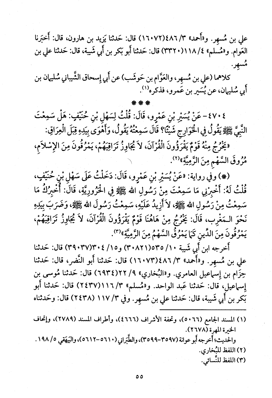 ٤٧٠٤ - عن يسير بن عَمرو، قال: قلت لسهل بن حنيف: هل سمعتَ النبي صَلى الله عَليه وسَلم يقول في الخوارج شيئا؟ قال: سمعته يقول، وأهوى بيده قبل العراق: