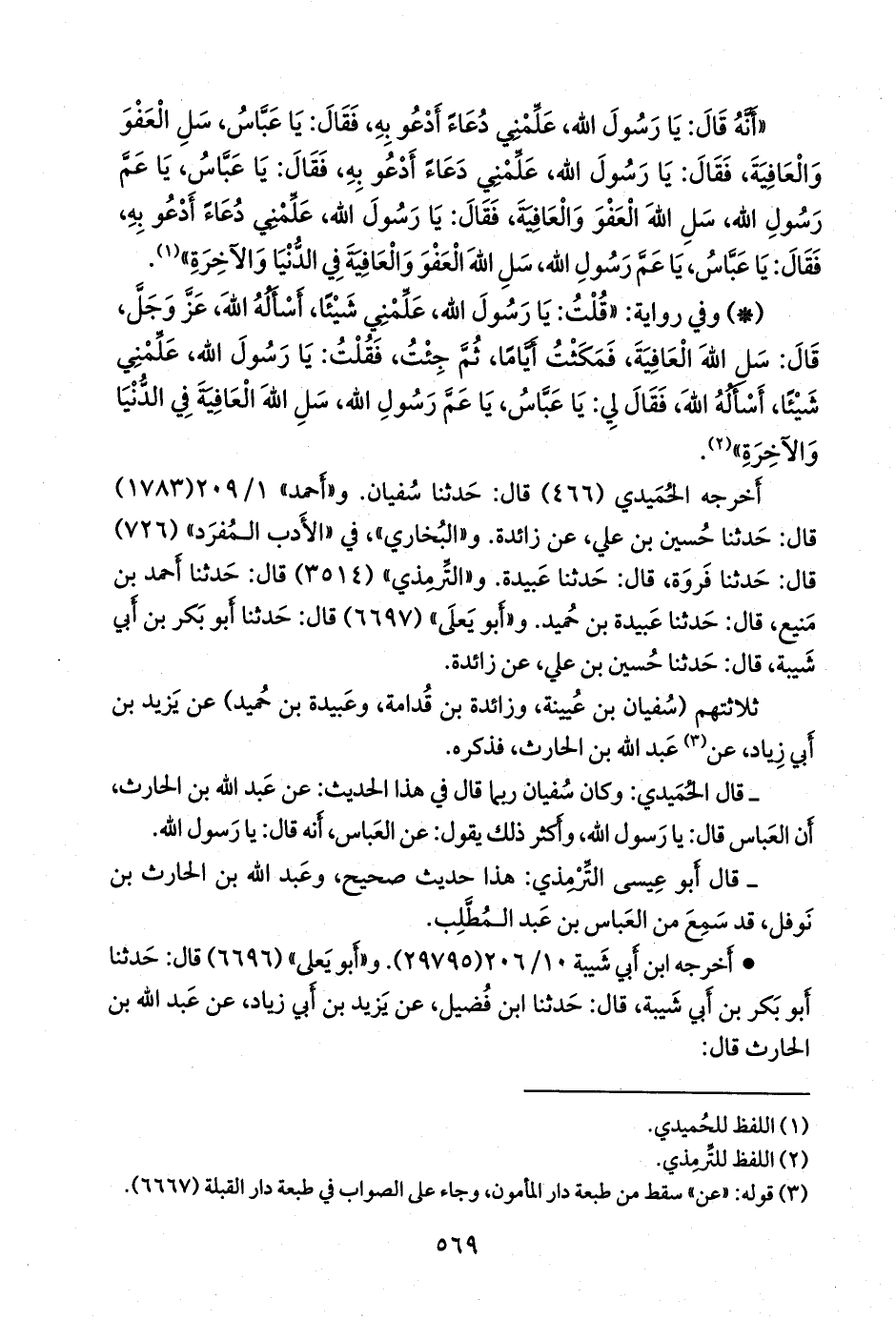 «قال العباس: يا رسول الله، علمني شيئًا أسأله ربي، قال: سل ربك العافية، قال: ثم لبث ما شاء الله، ثم قال: يا رسول الله، علمني شيئًا أسأله ربي، قال: سل ربك العافية في الدنيا والآخرة» (¬٢).