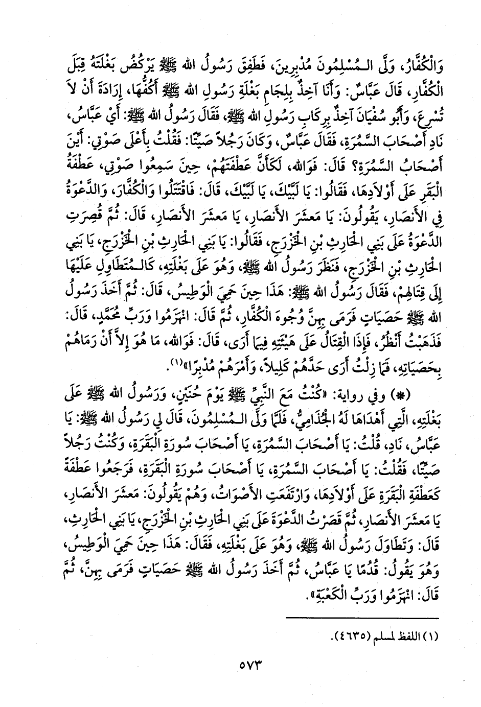 - وفي رواية: «لما كان يوم حنين، التقى المسلمون والمشركون، فولى المسلمون يومئذ، فلقد رأَيت رسول الله صَلى الله عَليه وسَلم وما معه أَحد إِلا أَبو سفيان بن الحارث بن عبد المطلب، آخذ بغرز النبي صَلى الله عَليه وسَلم لا يألو ما أَسرع نحو المشركين، فأَتيته، فأَخذت بلجامه، وهو على بغلة له شهباء، فقال: يا عباس، ناد أَصحاب السمرة، وكنت رجلا صيتا، فناديت بصوتي الأَعلى، أَين أَصحاب السمرة؟ فأَقبلوا كأَنهم الإِبل إِذا حنت إِلى أَولادها، يقولون: يا لبيك، يا لبيك، وأَقبل المشركون، فالتقوا هم والمسلمون، وتنادت الأَنصار: يا معشر الأَنصار، ثم قصرت الدعوة في بني الحارث بن الخزرج، فتنادوا: يا بني الحارث بن الخزرج، فنظر النبي صَلى الله عَليه وسَلم وهو على بغلته، كالمتطاول إِلى قتالهم، فقال: هذا حين حمي الوطيس، ثم أَخذ بيده من الحصى، فرماهم بها، ثم قال: انهزموا ورب الكعبة، فوالله ما زلت أَرى أَمرهم مدبرا، وحدهم كليلا، حتى هزمهم الله، فكأَني أَنظر إِلى النبي صَلى الله عَليه وسَلم يركض خلفهم على بغلته» (¬٢).