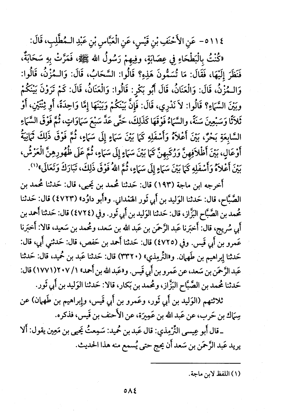 «كنت بالبطحاء في عصابة، وفيهم رسول الله صَلى الله عَليه وسَلم فمرت به سحابة، فنظر إليها، فقال: ما تسمون هذه؟ قالوا: السحاب، قال: والمزن، قالوا: والمزن، قال: والعنان، قال أَبو بكر: قالوا: والعنان، قال: كم ترون بينكم وبين السماء؟ قالوا: لا ندري، قال: فإن بينكم وبينها إما واحدة، أو ثنتين، أو ثلاثا وسبعين سنة، والسماء فوقها كذلك، حتى عد سبع سماوات، ثم فوق السماء السابعة بحر، بين أعلاه وأسفله كما بين سماء إلى سماء، ثم فوق ذلك ثمانية أوعال، بين أظلافهن وركبهن كما بين سماء إلى سماء، ثم على ظهورهن العرش، بين أعلاه وأسفله كما بين سماء إلى سماء، ثم الله فوق ذلك، تبارك وتعالى» (¬١).