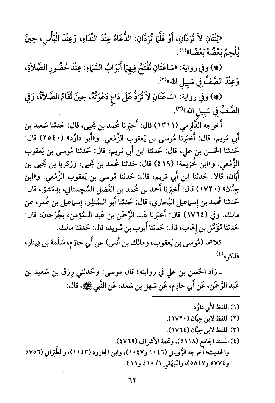 ثلاثتهم (عبد الرزاق بن همام، ومَعن بن عيسى، وإسماعيل بن أبي أويس) عن مالك بن أنس، عن أبي حازم بن دينار، عن سهل بن سعد الساعدي، أنه قال: ساعتان يفتح لهما أَبواب السماء، وقل داع ترد عليه دعوته: حضرة النداء للصلاة، والصف في سبيل الله. «موقوف».