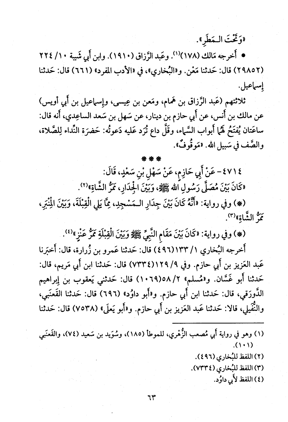 أخرجه البخاري ١/ ١٠٦ (٤٩٦) قال: حدثنا عَمرو بن زُرارة، قال: أخبرنا عبد العزيز بن أبي حازم. وفي ٩/ ١٠٥ (٧٣٣٤) قال: حدثنا ابن أبي مريم، قال: حدثنا أَبو غسان. و «مسلم» ٢/ ٥٨ (١٠٦٩) قال: حدثني يعقوب بن إبراهيم الدورقي، قال: حدثنا ابن أبي حازم. و «أَبو داود» (٦٩٦) قال: حدثنا القَعنَبي، والنفيلي، قالا: حدثنا عبد العزيز بن أبي حازم. و «أَبو يَعلى» (٧٥٣٨) قال: حدثنا