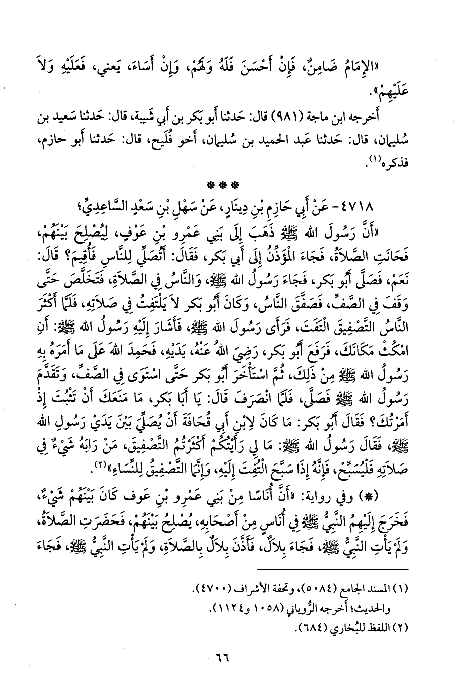 «أن رسول الله صَلى الله عَليه وسَلم ذهب إلى بني عَمرو بن عوف، ليصلح بينهم، فحانت الصلاة، فجاء المؤذن إلى أَبي بكر، فقال: أتصلي للناس فأقيم؟ قال: نعم، فصلى أَبو بكر، فجاء رسول الله صَلى الله عَليه وسَلم والناس في الصلاة، فتخلص حتى وقف في الصف، فصفق الناس، وكان أَبو بكر لا يلتفت في صلاته، فلما أكثر الناس التصفيق التفت، فرأى رسول الله صَلى الله عَليه وسَلم فأشار إليه رسول الله صَلى الله عَليه وسَلم: أن امكث مكانك، فرفع أَبو بكر، رضي الله عنه، يديه، فحمد الله على ما أمره به رسول الله صَلى الله عَليه وسَلم من ذلك، ثم استأخر أَبو بكر حتى استوى في الصف، وتقدم رسول الله صَلى الله عَليه وسَلم فصلى، فلما انصرف قال: يا أبا بكر، ما منعك أن تثبت إذ أمرتك؟ فقال أَبو بكر: ما كان لابن أبي قحافة أن يصلي بين يدي رسول الله صَلى الله عَليه وسَلم فقال رسول الله صَلى الله عَليه وسَلم: ما لي رأيتكم أكثرتم التصفيق، من رابه شيء في صلاته فليسبح، فإنه إذا سبح التفت إليه، وإنما التصفيق للنساء» (¬١).