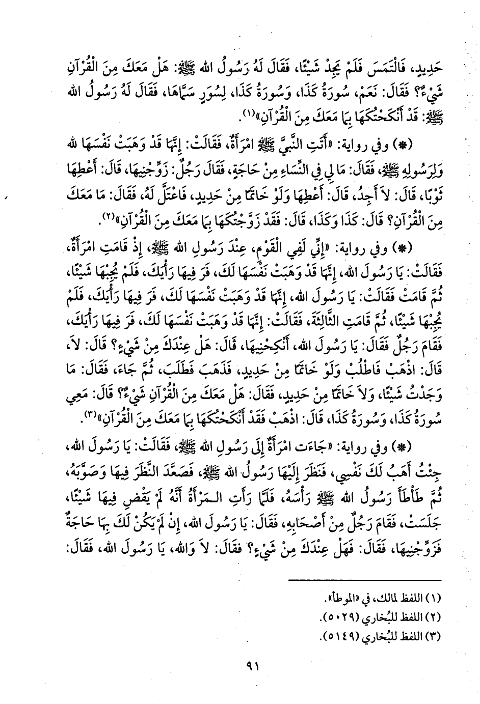 - وفي رواية: «إني لفي القوم، عند رسول الله صَلى الله عَليه وسَلم إذ قامت امرأة، فقالت: يا رسول الله، إنها قد وهبت نفسها لك، فر فيها رأيك، فلم يجبها شيئا، ثم قامت فقالت: يا رسول الله، إنها قد وهبت نفسها لك، فر فيها رأيك، فلم يجبها شيئا، ثم قامت الثالثة، فقالت: إنها قد وهبت نفسها لك، فر فيها رأيك، فقام رجل فقال: يا رسول الله، أنكحنيها، قال: هل عندك من شيء؟ قال: لا، قال: اذهب فاطلب ولو خاتما من حديد، فذهب فطلب، ثم جاء، فقال: ما وجدت شيئا، ولا خاتما من حديد، فقال: هل معك من القرآن شيء؟ قال: معي سورة كذا، وسورة كذا، قال: اذهب فقد أنكحتكها بما معك من القرآن» (¬١).