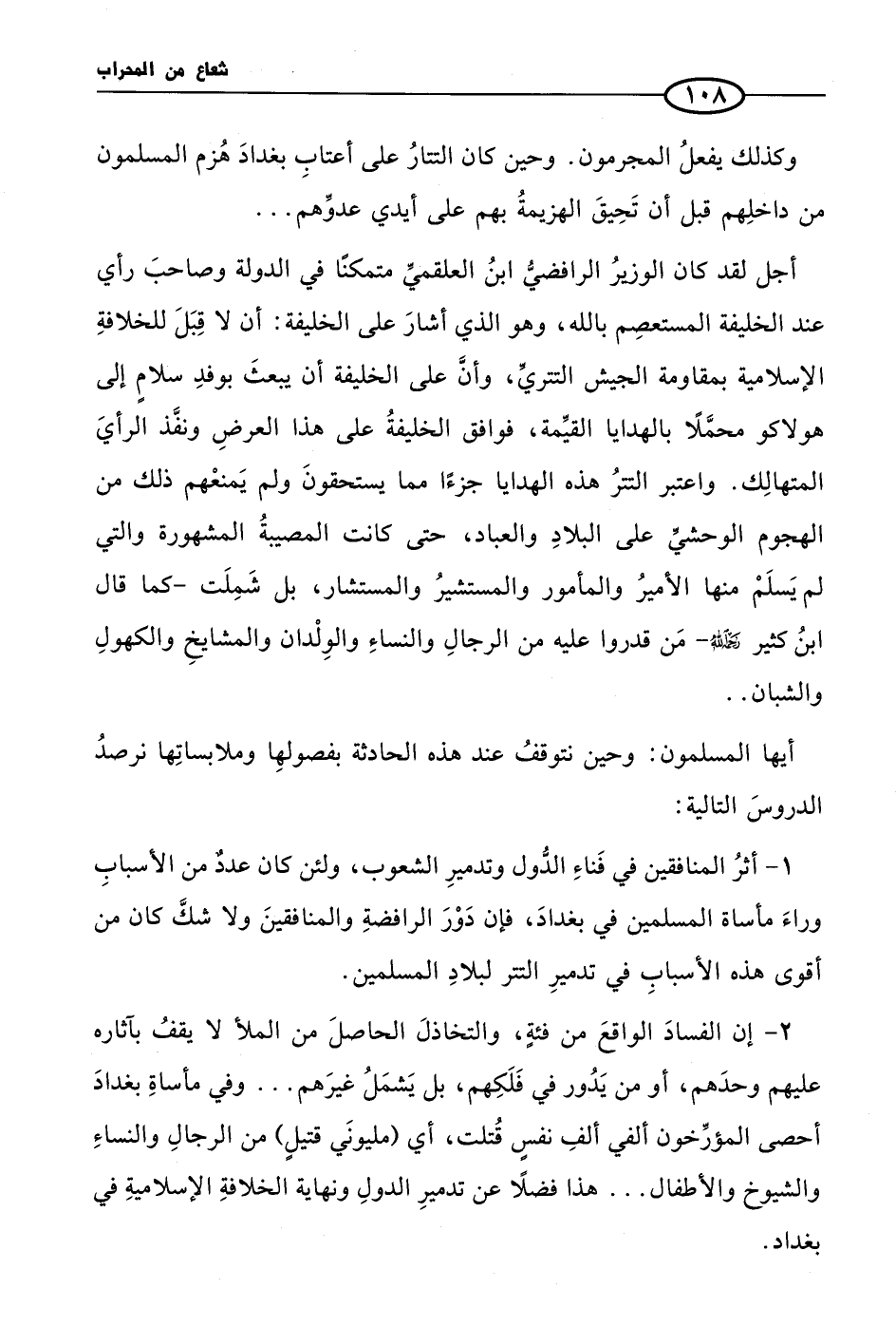 2 - إن الفسادَ الواقعَ من فئةٍ، والتخاذلَ الحاصلَ من الملأ لا يقفُ بآثاره عليهم وحدَهم، أو من يَدُور في فَلَكِهم، بل يَشمَلُ غيرَهم ... وفي مأساةِ بغدادَ أحصى المؤرِّخون ألفي ألفِ نفسٍ قُتلت، أي (مليونَي قتيلٍ) من الرجالِ والنساءِ والشيوخ والأطفال ... هذا فضلًا عن تدميرِ الدولِ ونهاية الخلافةِ الإسلاميةِ في بغداد.