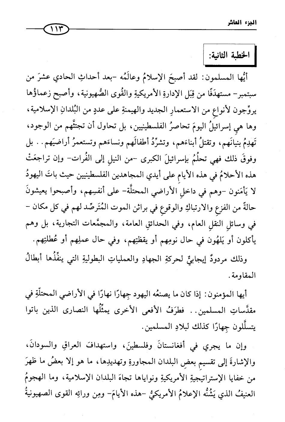 أيُّها المسلمون: لقد أصبحَ الإسلامُ وعالَمُه -بعد أحداثِ الحادي عشرَ من سبتمبر- مستهدَفًا من قِبَل الإدارةِ الأمريكيةِ والقُوى الصُّهيونية، وأصبح زعماؤُها يروِّجون لأنواعِ من الاستعمارِ الجديد والهيمنةِ على عددٍ من البُلدانِ الإسلامية، وها هيِ إسرائيلُ اليومَ تحاصرُ الفلسطينيين، بل تحاول أن تجتثَّهم من الوجود، تَهدِمُ بنيانَهم، وتقتلُ أبناءَهم، وتشرِّدُ أطفالَهم ونساءَهم وتستعمرُ أراضيَهم .. بل وفوقَ ذلك فهي تحلُمُ بإسرائيلَ الكبرى -من النيلِ إلى الفُرات- وإن تراجعَتْ هذه الأحلامُ في هذه الأيامِ على أيدي المجاهدين الفلسطينيين حيث باتَ اليهودُ لا يَأمَنون -وهم في داخلِ الأراضي المحتلَّة- على أنفسِهم، وأصبحوا يعيشونَ حالةً من الفزعِ والارتباكِ والوقوعِ في براثن الموت المُتَرصِّد لهم في كل مكان -في وسائلِ النقلِ العام، وفي الحدائقِ العامة، والمجمَّعات التجارية، بل وهم يأكلون أو يَلهُون في حال نومِهم أو يقظتِهم، وفي حال عملِهم أو عُطلتِهم.