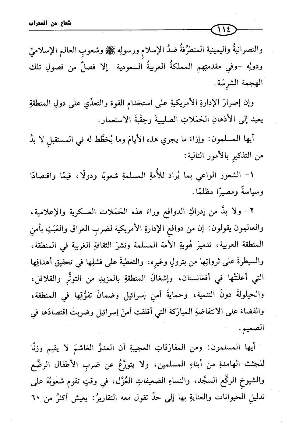 أيها المسلمون: وإزاءَ ما يجري هذه الأيامَ وما يُخطَّط له في المستقبلِ لا بدَّ من التذكيرِ بالأمور التالية: