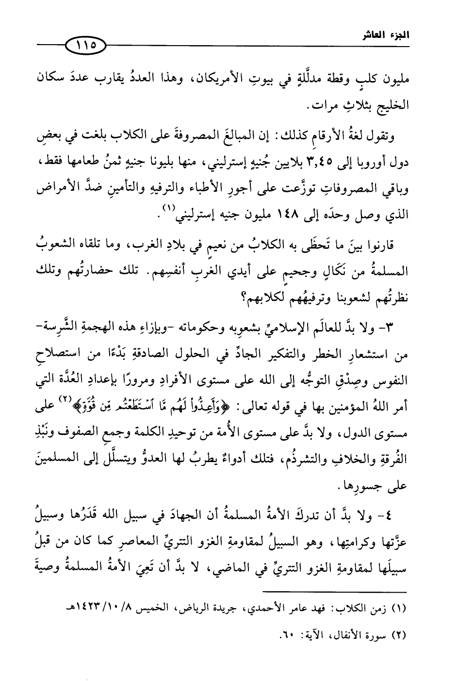 3 - ولا بدَّ للعالَم الإسلاميِّ بشعوِبه وحكوماته -وبإزاءِ هذه الهجمةِ الشَّرِسة- من استشعارِ الخطر والتفكير الجادِّ في الحلول الصادقةِ بَدْءًا من استصلاحِ النفوس وصِدْقِ التوجُّه إلى الله على مستوى الأفرادِ ومرورًا بإعدادِ العُدَّة التي أمر اللهُ المؤمنين بها في قوله تعالى: {وَأَعِدُّوا لَهُم مَّا اسْتَطَعْتُم مِّن قُوَّةٍ} (¬2) على مستوى الدول، ولا بدَّ على مستوى الأُمة من توحيدِ الكلمة وجمعِ الصفوف ونَبْذِ الفُرقةِ والخلافِ والتشرذُم، فتلك أدواءٌ يطربُ لها العدوُّ ويتسلَّل إلى المسلمينَ على جسورِها.