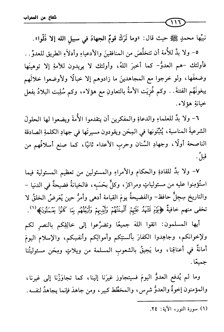 6 - ولا بدَّ للعلماءِ والدعاةِ والمفكرين أن يتقدموا الأُمةَ ويضعوا لها الحلولَ الشرعيةَ المناسبة، يُثبِّتَونها في المِحَن ويقودون مسيرتَها في جهادِ الكلمةِ الصادقة الناصحة أولًا، وجهادِ السِّنان وحربِ الأعداء ثانيًا، كما صنع أسلافُهم من قبلُ.