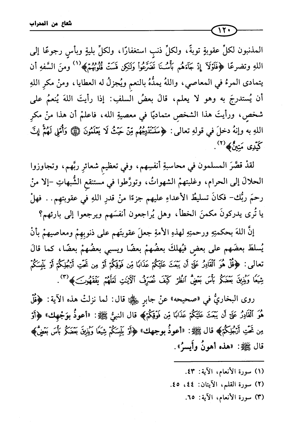المذنبون لكلِّ عقوبةٍ توبةً، ولكلِّ ذنبٍ استغفارًا، ولكلِّ بليةٍ وبأسٍ رجوعًا إلى اللهِ وتضرعًا {فَلَوْلا إِذْ جَاءهُمْ بَأْسُنَا تَضَرَّعُوا وَلَكِن قَسَتْ قُلُوبُهُمْ} (¬1) ومنَ السَّفهِ أن يتمادى المرءُ في المعاصي، واللهُ يمدُّهُ بالنعمِ ويُجزلُ له العطايا، ومنْ مكرِ اللهِ أن يُستدرجَ به وهو لا يعلم، قالَ بعضُ السلفِ: إذا رأيتَ اللهَ يُنعمُ على شخصٍ، ورأيتَ هذا الشخصِ متماديًا في معصيةِ الله، فاعلمْ أن هذا منْ مكرِ اللهِ به وإنهُ دخلَ في قولهِ تعالى: {سَنَسْتَدْرِجُهُم مِّنْ حَيْثُ لا يَعْلَمُونَ (44) وَأُمْلِي لَهُمْ إِنَّ كَيْدِي مَتِينٌ} (¬2).