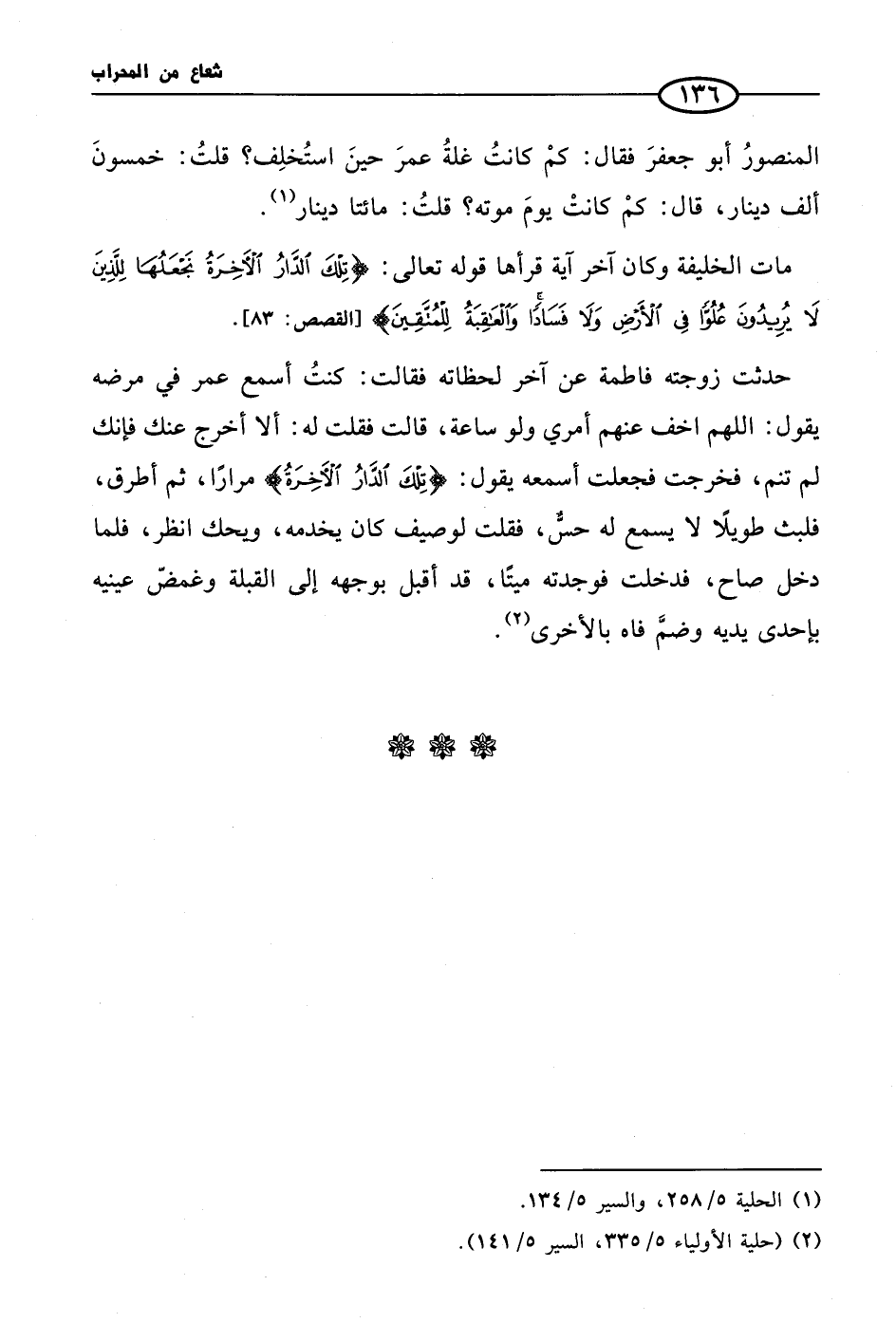 المنصورُ أبو جعفرَ فقال: كمْ كانتُ غلةُ عمرَ حينَ استُخلِف؟ قلتُ: خمسونَ ألف دينار، قال: كمْ كانتْ يومَ موته؟ قلتُ: مائتا دينار (¬1).