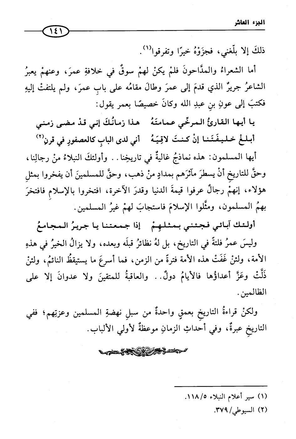 وليسَ عمرُ فلتةً في التاريخ، بل لهُ نظائرُ قبلَه وبعده، ولا يزالُ الخيرُ في هذهِ الأمة، ولئنْ غَفَتْ هذه الأمة فترةً من الزمن، فما أسرعَ ما يستيقظُ النائمُ، ولئنْ ذَلَّتْ وعَزَّ أعداؤُها فالأيامُ دولٌ .. والعاقبةُ للمتقينَ ولا عدوانَ إلا على الظالمين.