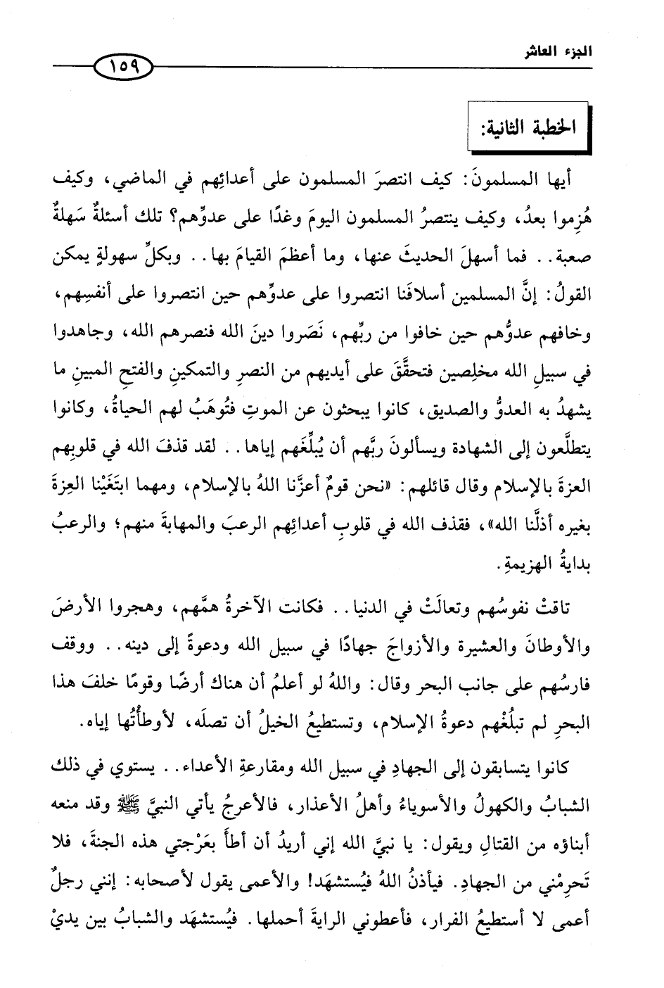 كانوا يتسابقون إلى الجهادِ في سبيل الله ومقارعةِ الأعداء .. يستوي في ذلك الشبابُ والكهولُ والأسوياءُ وأهلُ الأعذار، فالأعرجُ يأتي النبيَّ صلى الله عليه وسلم وقد منعه أبناؤه من القتالِ ويقول: يا نبيَّ الله إني أريدُ أن أطأَ بعَرْجتي هذه الجنةَ، فلا تَحرِمْني من الجهادِ. فيأذنُ اللهُ فيُستشهَد! والأعمى يقول لأصحابه: إنني رجلٌ أعمى لا أستطيعُ الفرار، فأعطوني الرايةَ أحملها. فيُستشهَد والشبابُ بين يديْ