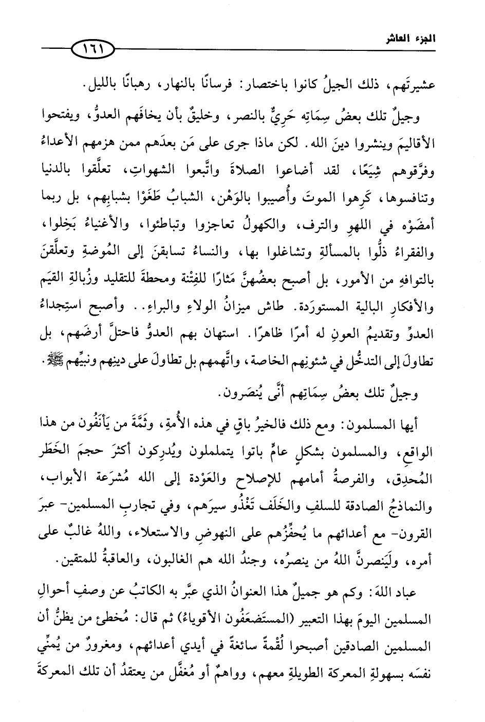 وجيلٌ تلك بعضُ سِمَاتِه حَرِيٌّ بالنصر، وخليقٌ بأن يخافَهم العدوُّ، ويفتحوا الأقاليمَ وينشروا دينَ الله. لكن ماذا جرى على مَن بعدَهم ممن هزمهم الأعداءُ وفرَّقوهم شِيَعًا، لقد أضاعوا الصلاةَ واتَّبعوا الشهواتِ، تعلَّقوا بالدنيا وتنافسوها، كَرِهوا الموتَ وأُصيبوا بالوَهْن، الشبابُ طَغَوْا بشبابِهم، بل ربما أمضَوْه في اللهوِ والترف، والكهولُ تعاجزوا وتباطئوا، والأغنياءُ بَخِلوا، والفقراءُ ذلُّوا بالمسألةِ وتشاغلوا بها، والنساءُ تسابقنَ إلى المُوضةِ وتعلَّقنَ بالتوافهِ من الأمور، بل أصبح بعضُهنَّ مَثارًا للفِتْنة ومحطةَ للتقليد وزُبالةِ القيَم والأفكارِ البالية المستورَدة. طاش ميزانُ الولاءِ والبراءِ .. وأصبح استِجداءُ العدوِّ وتقديمُ العونِ له أمرًا ظاهرًا. استهان بهم العدوُّ فاحتلَّ أرضَهم، بل تطاولَ إلى التدخُّل في شئونِهم الخاصة، واتَّهمهم بل تطاولَ على دينِهم ونبيِّهم صلى الله عليه وسلم.