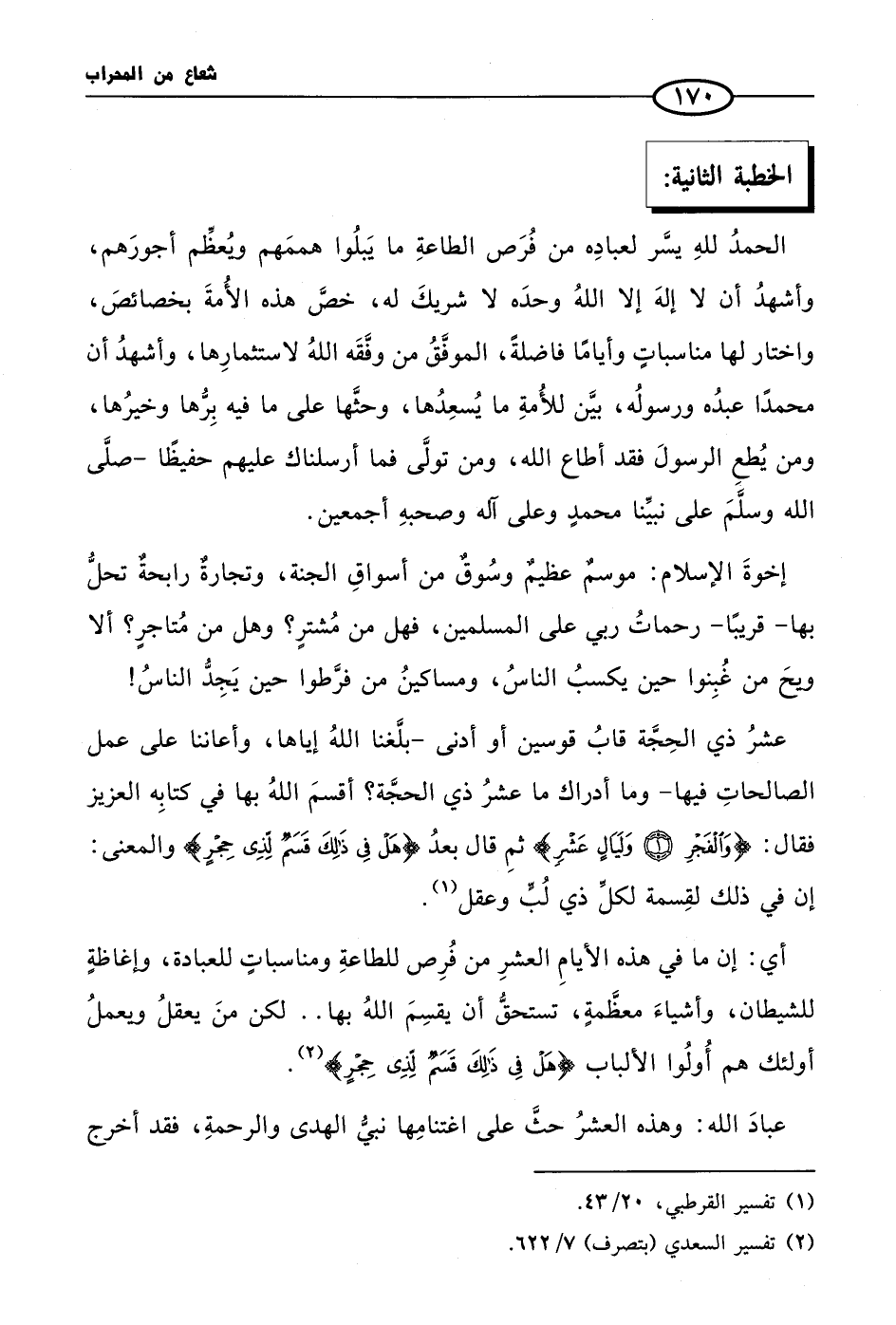 عشرُ ذي الحِجَّة قابُ قوسين أو أدنى- بلَّغنا اللهُ إياها، وأعاننا على عمل الصالحاتِ فيها- وما أدراك ما عشرُ ذي الحجَّة؟ أقسمَ اللهُ بها في كتابِه العزيز فقال: {وَالْفَجْرِ (1) وَلَيَالٍ عَشْرٍ} ثمِ قال بعدُ {هَلْ فِي ذَلِكَ قَسَمٌ لِّذِي حِجْرٍ} والمعنى: إن في ذلك لقِسمة لكلِّ ذي لُبٍّ وعقل (¬1).