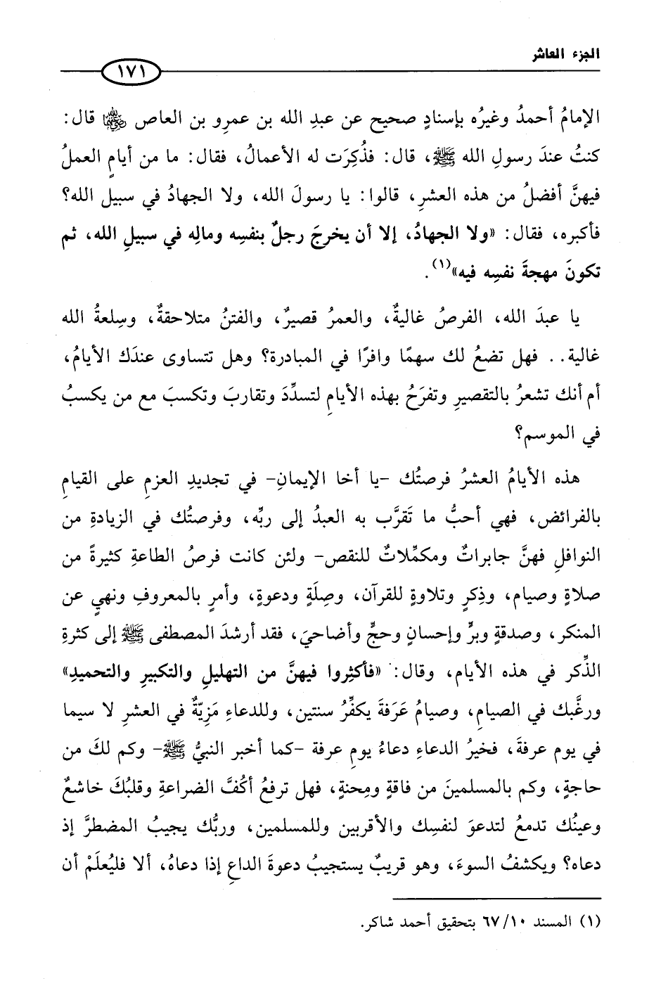 الإمامُ أحمدُ وغيرُه بإسنادٍ صحيح عن عبدِ الله بن عمرِو بن العاص رضي الله عنهما قال: كنتُ عندَ رسولِ الله صلى الله عليه وسلم، قال: فذُكِرَت له الأعمالُ، فقال: ما من أيامٍ العملُ فيهنَّ أفضلُ من هذه العشرِ، قالوا: يا رسولَ الله، ولا الجهادُ في سبيل الله؟ فأكبره، فقال: «ولا الجهادُ، إلا أن يخرجَ رجلٌ بنفسِه ومالِه في سبيلِ الله، ثم تكونَ مهجةَ نفسِه فيه» (¬1).