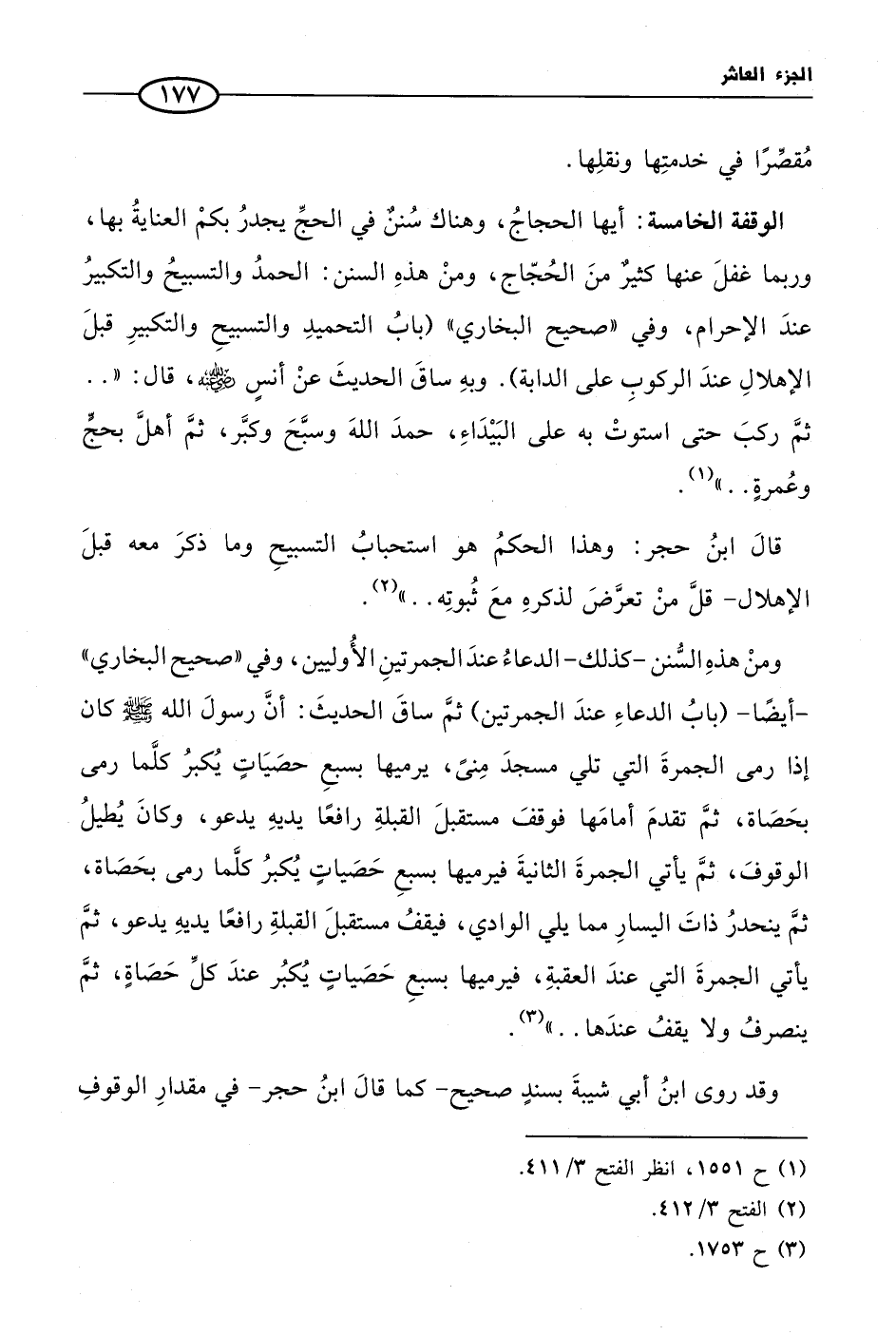 ومنْ هذهِ السُّنن- كذلك- الدعاءُ عندَ الجمرتينِ الأُوليين، وفي «صحيح البخاري» - أيضًا- (بابُ الدعاءِ عندَ الجمرتين) ثمَّ ساقَ الحديثَ: أنَّ رسولَ الله صلى الله عليه وسلم كان إذا رمى الجمرةَ التي تلي مسجدَ مِنىً، يرميها بسبعِ حصَيَاتٍ يُكبرُ كلَّما رمى بحَصَاة، ثمَّ تقدمَ أمامَها فوقفَ مستقبلَ القبلةِ رافعًا يديهِ يدعو، وكانَ يُطيلُ الوقوفَ، ثمَّ يأتي الجمرةَ الثانيةَ فيرميها بسبعِ حَصَياتٍ يُكبرُ كلَّما رمى بحَصَاة، ثمَّ ينحدرُ ذاتَ اليسارِ مما يلي الوادي، فيقفُ مستقبلَ القبلةِ رافعًا يديهِ يدعو، ثمَّ يأتي الجمرةَ التي عندَ العقبةِ، فيرميها بسبعِ حَصَياتٍ يُكبُر عندَ كلِّ حَصَاةٍ، ثمَّ ينصرفُ ولا يقفُ عندَها .. » (¬3).