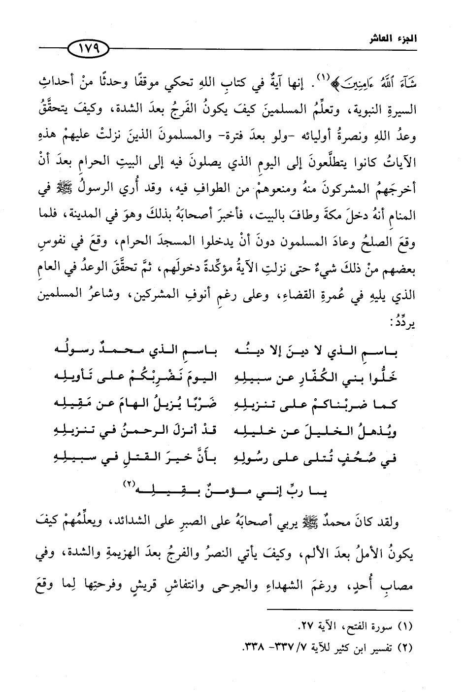 شَاءَ اللَّهُ آمِنِينَ} (¬1). إنها آيةٌ في كتابِ اللهِ تحكي موقفًا وحدثًا منْ أحداثِ السيرةِ النبوية، وتعلِّمُ المسلمينَ كيفَ يكونُ الفَرجُ بعدَ الشدة، وكيفَ يتحقَّقُ وعدُ اللهِ ونصرةُ أوليائه- ولو بعدَ فترة- والمسلمونَ الذينَ نزلتْ عليهمْ هذهِ الآياتُ كانوا يتطلَّعونَ إلى اليومِ الذي يصلونَ فيه إلى البيتِ الحرامِ بعدَ أنْ أخرجَهمُ المشركونَ منهُ ومنعوهمْ من الطوافِ فيه، وقد أُري الرسولُ صلى الله عليه وسلم في المنامِ أنهُ دخلَ مكةَ وطافَ بالبيت، فأخبرَ أصحابَهُ بذلكَ وهوَ في المدينة، فلما وقعَ الصلحُ وعادَ المسلمون دونَ أنْ يدخلوا المسجدَ الحرام، وقعَ في نفوسِ بعضهم منْ ذلكَ شيءٌ حتى نزلتِ الآيةُ مؤكِّدةً دخولَهم، ثمَّ تحقَّقَ الوعدُ في العامِ الذي يليهِ في عُمرةِ القضاءِ، وعلى رغمِ أنوفِ المشركين، وشاعرُ المسلمين يردِّدُ: