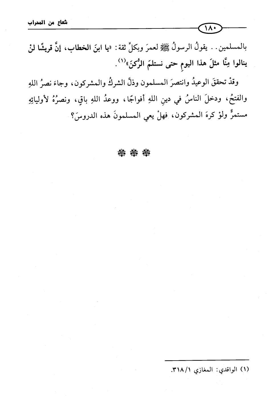 وقدْ تحققَ الوعيدُ وانتصرَ المسلمون وذلَّ الشركُ والمشركون، وجاءَ نصرُ اللهِ والفتحُ، ودخلَ الناسُ في دينِ اللهِ أفواجًا، ووعدُ اللهِ باقٍ، ونصرُهُ لأوليائِهِ مستمرٌّ ولوْ كرهَ المشركون، فهلْ يعي المسلمونَ هذه الدروسَ؟