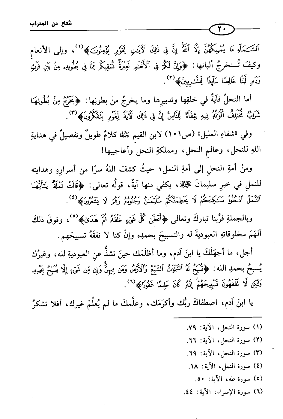 وفي «شفاءِ العليل» لابن القيمِ رحمهُ الله كلامٌ طويلٌ وتفصيلٌ في هدايةِ اللهِ للنحل، وعالمِ النحل، ومملكةِ النحل وأعاجيبها (¬4)!