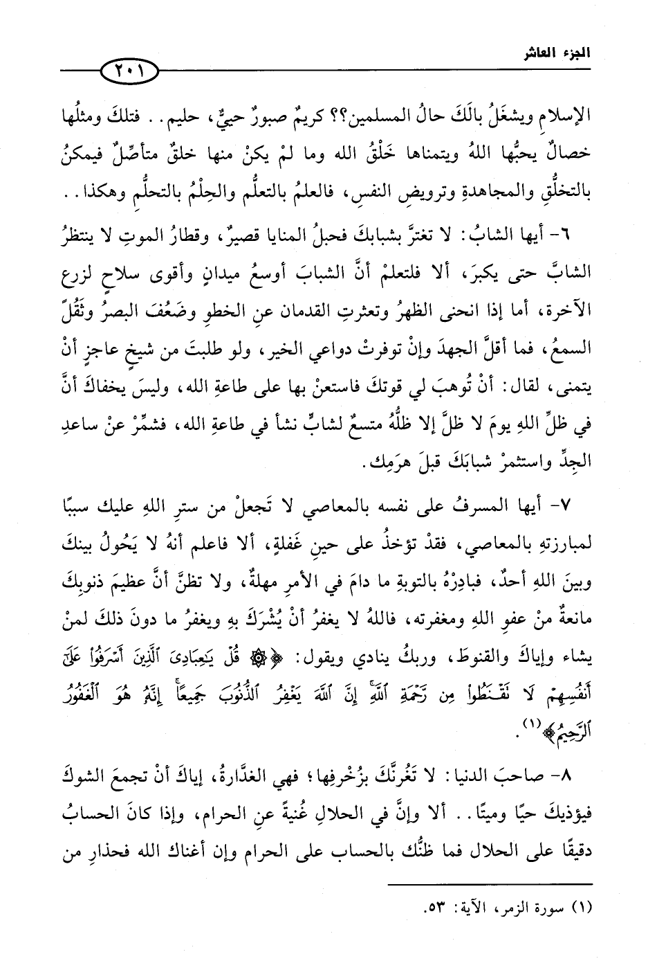 6 - أيها الشابُ: لا تغترَّ بشبابكَ فحبلُ المنايا قصيرٌ، وقطارُ الموتِ لا ينتظرُ الشابَّ حتى يكبرَ، ألا فلتعلمْ أنَّ الشبابَ أوسعُ ميدانٍ وأقوى سلاحٍ لزرع الآخرة، أما إذا انحنى الظهرُ وتعثرتِ القدمان عنِ الخطوِ وضَعُفَ البصرُ وثَقُلً السمعُ، فما أقلَّ الجهدَ وإنْ توفرتْ دواعي الخير، ولو طلبتَ من شيخٍ عاجزٍ أنْ يتمنى، لقال: أنْ تُوهبَ لي قوتكَ فاستعنْ بها على طاعةِ الله، وليسَ يخفاكَ أنَّ في ظلِّ اللهِ يومَ لا ظلَّ إلا ظلُّهُ متسعٌ لشابٍّ نشأ في طاعةِ الله، فشمِّرْ عنْ ساعدِ الجِدِّ واستثمرْ شبابَكَ قبلَ هرَمِك.