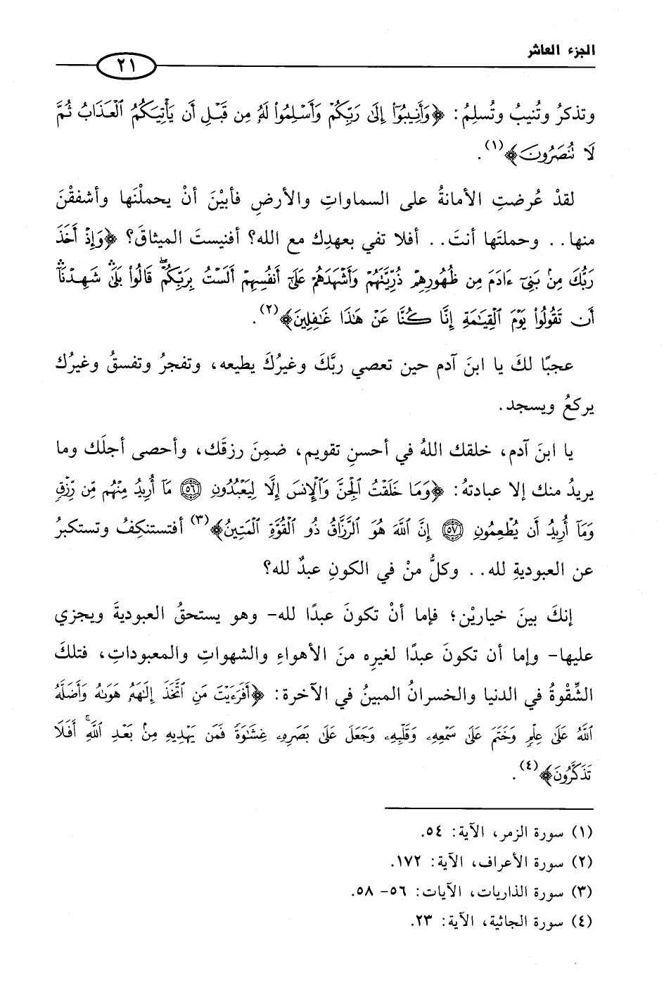وتذكرُ وتُنيبُ وتُسلِمُ: {وَأَنِيبُوا إِلَى رَبِّكُمْ وَأَسْلِمُوا لَهُ مِن قَبْلِ أَن يَأْتِيَكُمُ الْعَذَابُ ثُمَّ لا تُنصَرُونَ} (¬1).