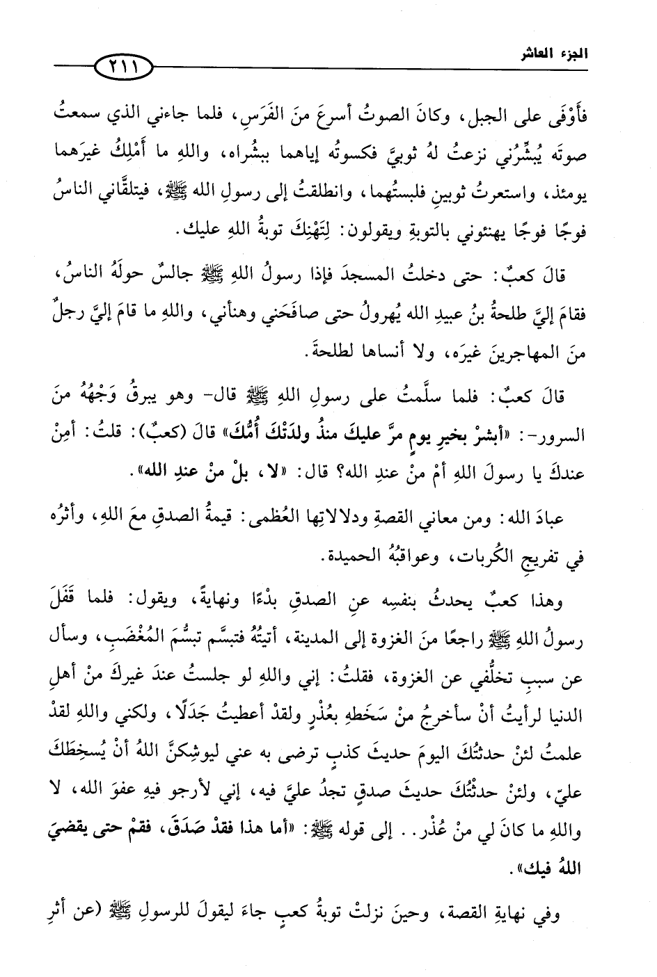 قالَ كعبٌ: فلما سلَّمتُ على رسولِ اللهِ صلى الله عليه وسلم قال- وهو يبرقُ وَجْهُهُ منَ السرور-: «أبشرْ بخيرِ يومٍ مرَّ عليكَ منذُ ولدَتْكَ أُمُّكَ» قالَ (كعبٌ): قلتُ: أمِنْ عندكَ يا رسولَ اللهِ أمْ منْ عندِ الله؟ قال: «لا، بلْ منْ عندِ الله».