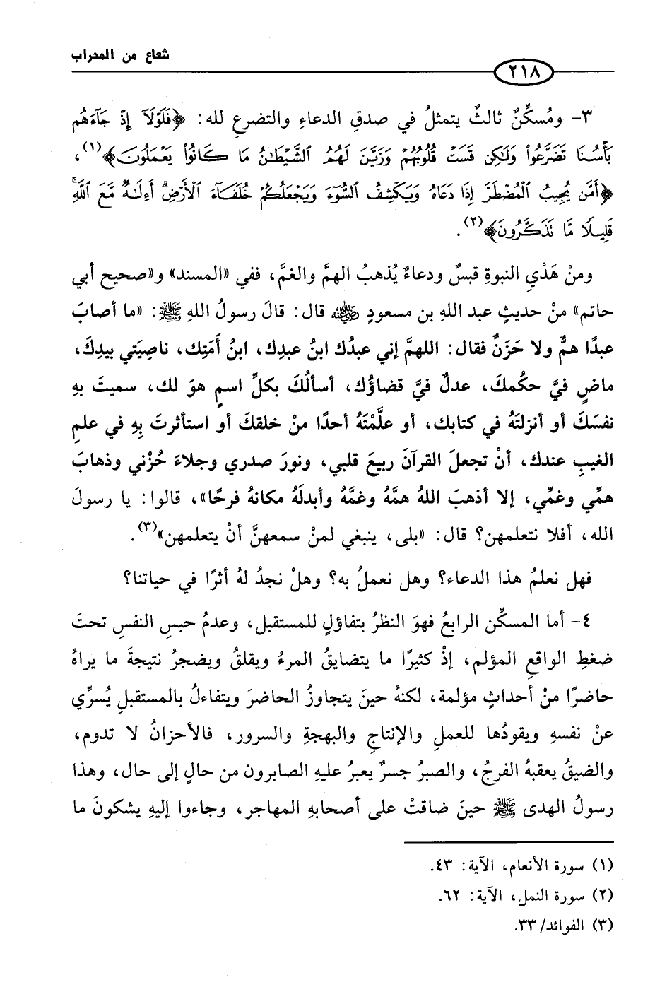 ومنْ هَدْيِ النبوةِ قبسٌ ودعاءٌ يُذهبُ الهمَّ والغمَّ، ففي «المسند» و «صحيح أبي حاتم» منْ حديثٍ عبد اللهِ بن مسعودٍ رضيَ اللهُ عنهُ قال: قالَ رسولُ اللهِ صلى الله عليه وسلم: «ما أصابَ عبدًا همٌّ ولا حَزَنٌ فقال: اللهمَّ إني عبدُك ابنُ عبدِك، ابنُ أَمَتِك، ناصِيَتي بيدِكَ، ماضٍ فيَّ حكُمكَ، عدلٌ فيَّ قضاؤُك، أسألُكَ بكلِّ اسمٍ هوَ لك، سميتَ بهِ نفسَكَ أو أنزلتَهُ في كتابك، أو علَّمْتَهُ أحدًا منْ خلقكَ أو استأثرتَ بِهِ في علمِ الغيبِ عندك، أنْ تجعلَ القرآنَ ربيعَ قلبي، ونورَ صدري وجلاءَ حُزْني وذهابَ همِّي وغمِّي، إلا أذهبَ اللهُ همَّهُ وغمَّهُ وأبدلَهُ مكانهُ فرحًا»، قالوا: يا رسولَ الله، أفلا نتعلمهن؟ قال: «بلى، ينبغي لمنْ سمعهنَّ أنْ يتعلمهن» (¬3).