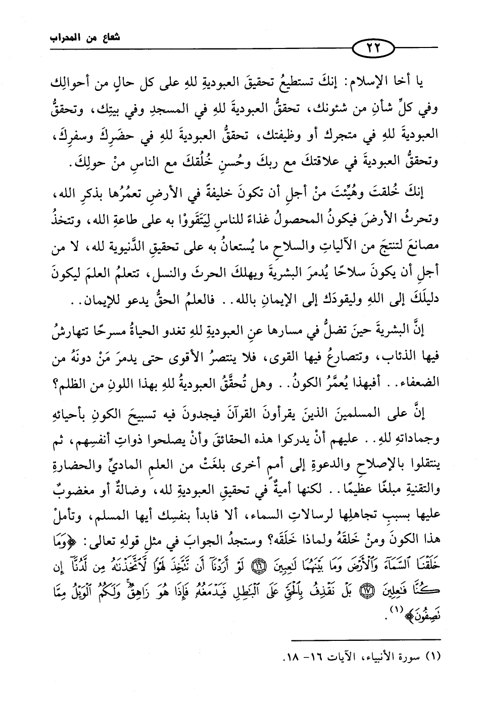 إنَّ البشريةَ حينَ تضلُّ في مسارها عنِ العبوديةِ للهِ تغدو الحياةُ مسرحًا تتهارشُ عليه الذئاب، وتتصارعُ فيها القوي، فلا ينتصرُ الأقوى حتى يدمرَ مَنْ دونَهُ من الضعفاء .. أفبهذا يُعمَّرُ الكونُ .. وهل تُحقَّقُ العبوديةُ للهِ بهذا اللونِ من الظلم؟