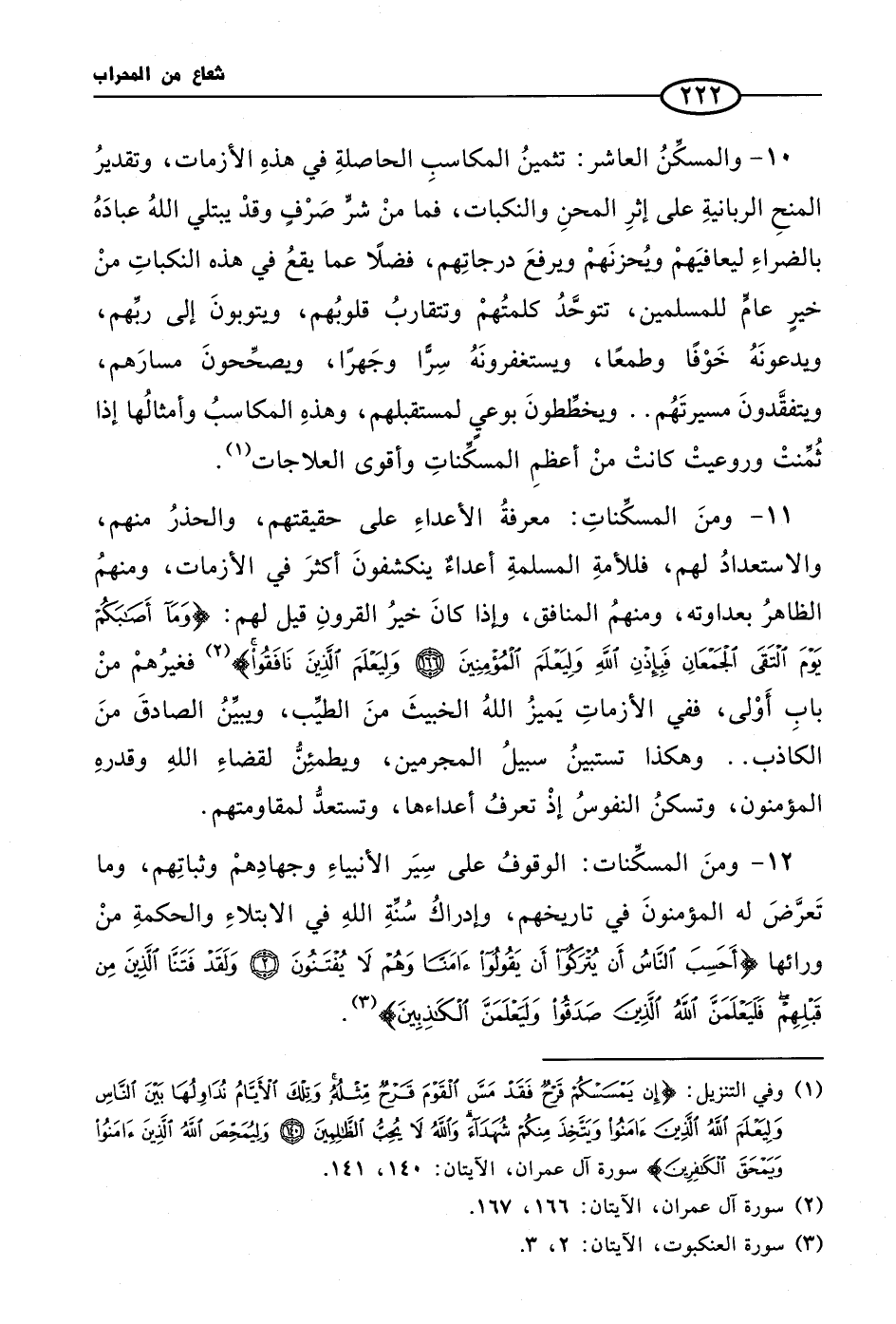 10 - والمسكِّنُ العاشر: تثمينُ المكاسبِ الحاصلةِ في هذهِ الأزمات، وتقديرُ المنحِ الربانيةِ على إثرِ المحنِ والنكبات، فما منْ شرٍّ صَرْفٍ وقدْ يبتلي اللهُ عبادَهُ بالضراءِ ليعافيَهمْ ويُحزنَهمْ ويرفعَ درجاتِهم، فضلًا عما يقعُ في هذه النكباتِ منْ خيرٍ عامٍّ للمسلمين، تتوحَّدُ كلمتُهمْ وتتقاربُ قلوبُهم، ويتوبونَ إلى ربِّهم، ويدعونَهُ خَوْفًا وطمعًا، ويستغفرونَهُ سِرًّا وجَهرًا، ويصحِّحونَ مسارَهم، ويتفقَّدونَ مسيرتَهُم .. ويخطِّطونَ بوعيٍ لمستقبلهم، وهذهِ المكاسبُ وأمثالُها إذا ثُمِّنتْ وروعيتْ كانتْ منْ أعظمِ المسكِّناتِ وأقوى العلاجات (¬1).