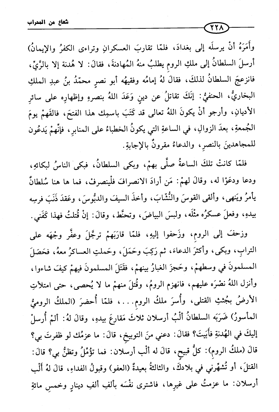 وأَمَرَهُ أنْ يرسلَه إلى بغدادَ، فلمّا تقاربَ العسكرانِ وتراءى الكفرُ والإيمانُ) أرسلَ السلطانُ إلى ملكِ الرومِ يطلبُ منهُ المُهادنةَ، فقالَ: لا هُدنة إلا بالرَّيِّ، فانزعجَ السلطانُ لذلكَ، فقالَ لهُ إمامُه وفقيهُه أبو نصرٍ محمّدُ بنُ عبدِ الملكِ البخاريُّ، الحنفيُّ: إنَكَ تقاتلُ عن دينٍ وَعَدَ اللهُ بنصرهِ وإظهارِه على سائرِ الأديانِ، وأرجو أنْ يكونَ اللهُ تعالى قد كَتَبَ باسمِك هذا الفتحَ، فالقَهمْ يومَ الجُمعةِ، بعدَ الزوالِ، في الساعةِ التي يكونُ الخطباءُ على المنابرِ، فإنِّهمْ يَدعُون للمجاهدينَ بالنصرِ، والدعاءُ مقرونٌ بالإجابةِ.