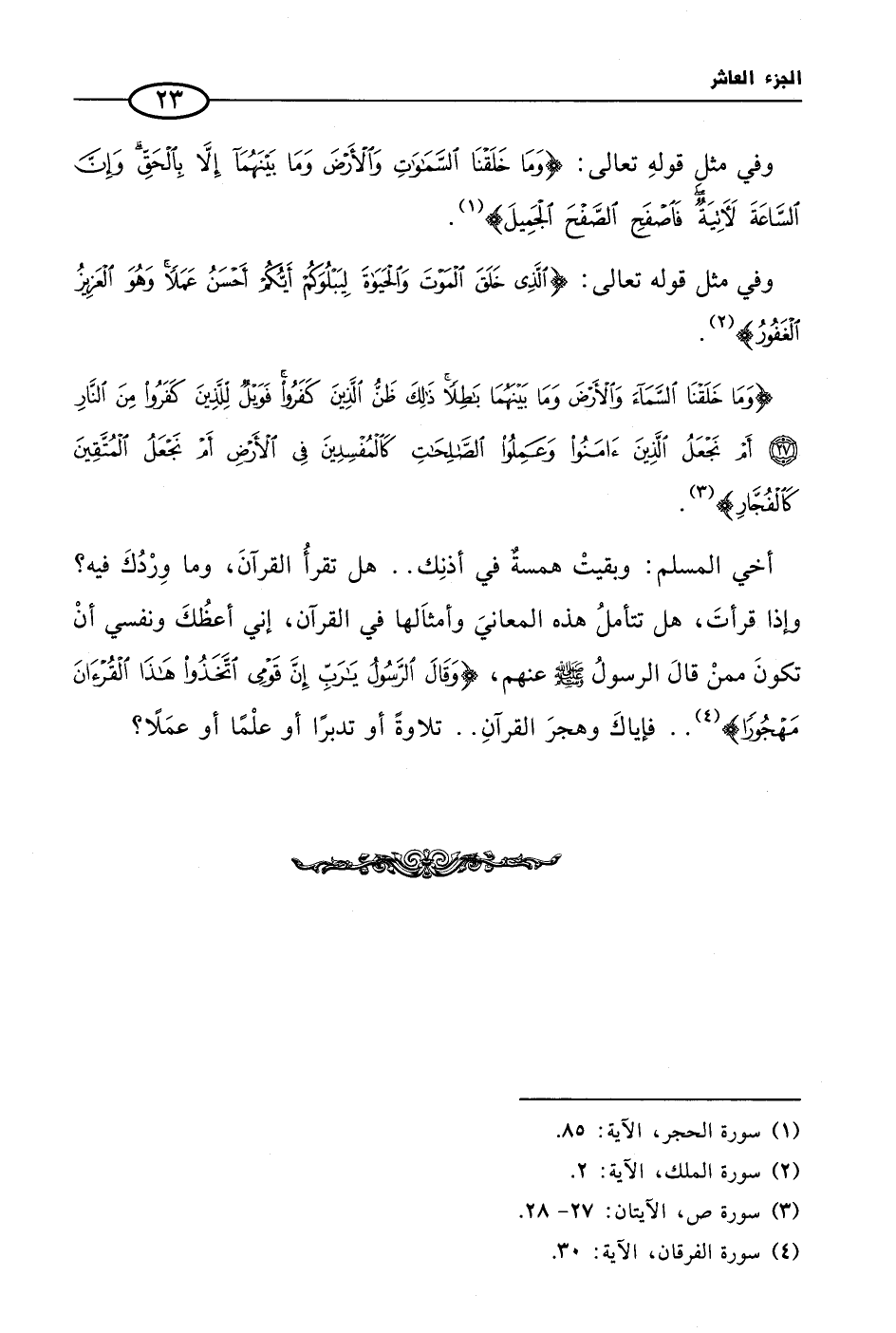 {وَمَا خَلَقْنَا السَّمَاءَ وَالأَرْضَ وَمَا بَيْنَهُمَا بَاطِلًا ذَلِكَ ظَنُّ الَّذِينَ كَفَرُوا فَوَيْلٌ لِّلَّذِينَ كَفَرُوا مِنَ النَّارِ (27) أَمْ نَجْعَلُ الَّذِينَ آمَنُوا وَعَمِلُوا الصَّالِحَاتِ كَالْمُفْسِدِينَ فِي الأَرْضِ أَمْ نَجْعَلُ الْمُتَّقِينَ كَالْفُجَّارِ} (¬3).