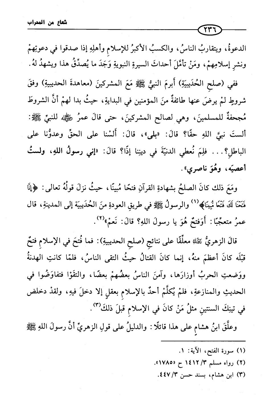 ومَعَ ذلك كانَ الصلحُ بشهادةِ القرآنِ فتحًا مُبينًا، حيثُ نزلَ قولُهُ تعالى: {إِنَّا فَتَحْنَا لَكَ فَتْحًا مُّبِينًا} (¬1) والرسولُ صلى الله عليه وسلم في طريقِ العودةِ منَ الحُدَيبيَة إلى المدينةِ، قال عمرُ متعجِّبًا: أَوَفتحٌ هُوَ يا رسولَ اللهِ؟ قالَ: نَعمْ» (¬2).