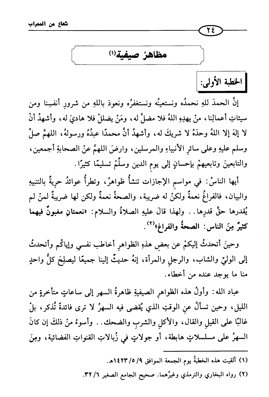 أيها الناسُ: في مواسمِ الإجازات تنشأُ ظواهرُ، وتطرأُ عوائدُ حرِيةٌ بالتنبيهِ والبيان، فالفراغُ نعمةٌ ولكنْ له ضريبة، والصحةُ نعمةٌ ولكن لها ضريبةٌ لمنْ لم يُقدرها حقَّ قدرِها .. ولهذا قالَ عليهِ الصلاةُ والسلام:
