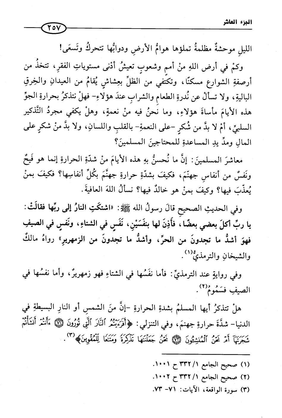 هلْ تتذكرُ أيها المسلمُ بشدةِ الحرارةِ- إنَّ منَ الشمسِ أو النارِ البسيطةِ في الدنيا- شدَّةَ حرارةِ جهنمَ، وفي التنزلي: {أَفَرَأَيْتُمُ النَّارَ الَّتِي تُورُونَ (71) أَأَنتُمْ أَنشَأْتُمْ شَجَرَتَهَا أَمْ نَحْنُ الْمُنشِئونَ (72) نَحْنُ جَعَلْنَاهَا تَذْكِرَةً وَمَتَاعًا لِّلْمُقْوِينَ} (¬3).