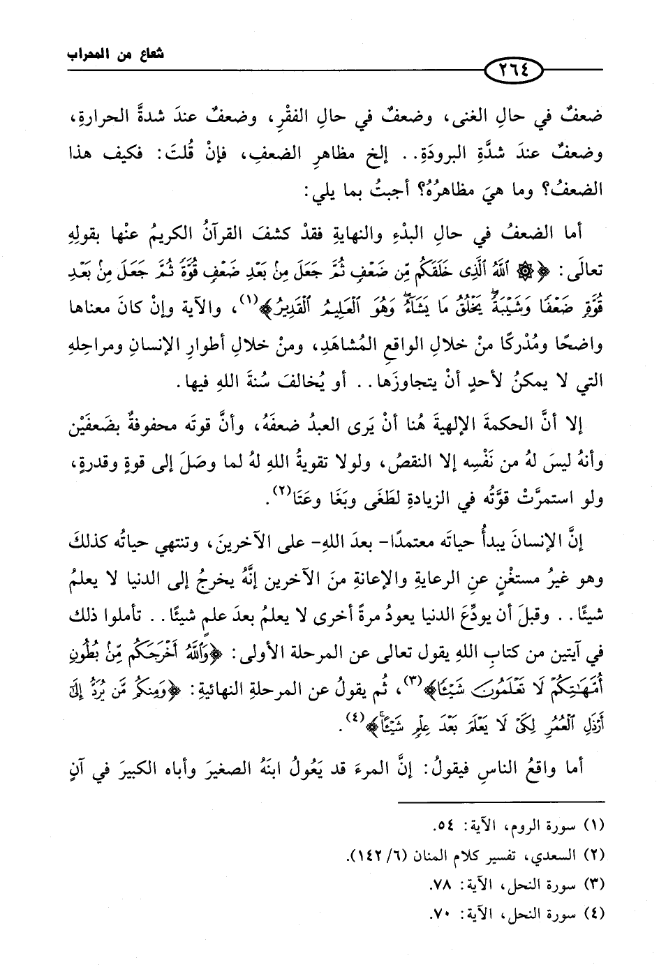 أما الضعفُ في حالِ البدْءِ والنهايةِ فقدْ كشفَ القرآنُ الكريمُ عنْها بقولِهِ تعالَى: {اللَّهُ الَّذِي خَلَقَكُم مِّن ضَعْفٍ ثُمَّ جَعَلَ مِن بَعْدِ ضَعْفٍ قُوَّةً ثُمَّ جَعَلَ مِن بَعْدِ قُوَّةٍ ضَعْفًا وَشَيْبَةً يَخْلُقُ مَا يَشَاءُ وَهُوَ الْعَلِيمُ الْقَدِيرُ} (¬1)، والآية وإنْ كانَ معناها واضحًا ومُدْركًا منْ خلالِ الواقعِ المُشاهَدِ، ومنْ خلالِ أطوارِ الإنسانِ ومراحِلهِ التي لا يمكنُ لأحدٍ أنْ يتجاوزَها .. أو يُخالفَ سُنةَ اللهِ فيها.