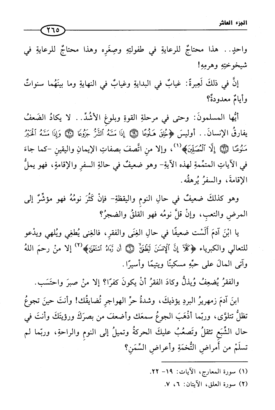 يا ابْنَ آدمَ أَلَسْت ضعيفًا في حالِ الغِنَى والفقرِ، فالغِنى يُطغِي ويُلهي ويدْعو للتعالي والكبرياء {كَلاَّ إِنَّ الإِنسَانَ لَيَطْغَى (6) أَن رَّآهُ اسْتَغْنَى} (¬2) إلا منْ رحمَ اللهُ وآتى المالَ على حبِّهِ مسكينًا ويتيمًا وأسيرًا.